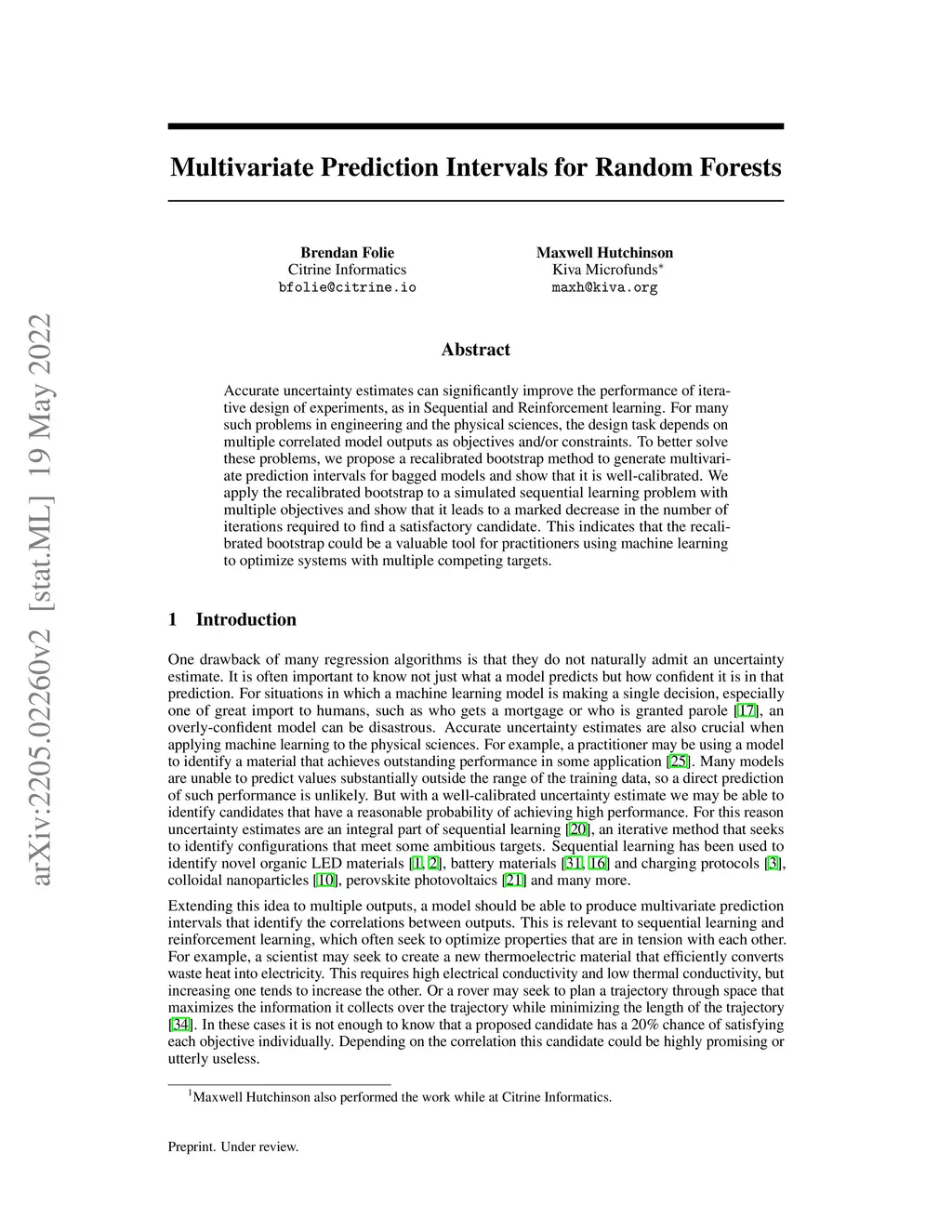 Accurate uncertainty estimates can significantly improve the performance of iterative design of experiments, as in Sequential and Reinforcement learning. For many such problems in engineering and the physical sciences, the design task depends on multiple correlated model outputs as objectives and/or constraints. To better solve these problems, we propose a recalibrated bootstrap method to generate multivariate prediction intervals for bagged models and show that it is well-calibrated. We apply the recalibrated bootstrap to a simulated sequential learning problem with multiple objectives and show that it leads to a marked decrease in the number of iterations required to find a satisfactory candidate. This indicates that the recalibrated bootstrap could be a valuable tool for practitioners using machine learning to optimize systems with multiple competing targets.