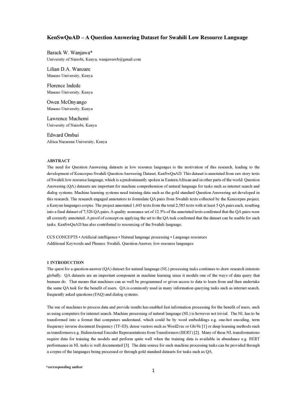 KenSwQuAD -- A Question Answering Dataset for Swahili Low Resource