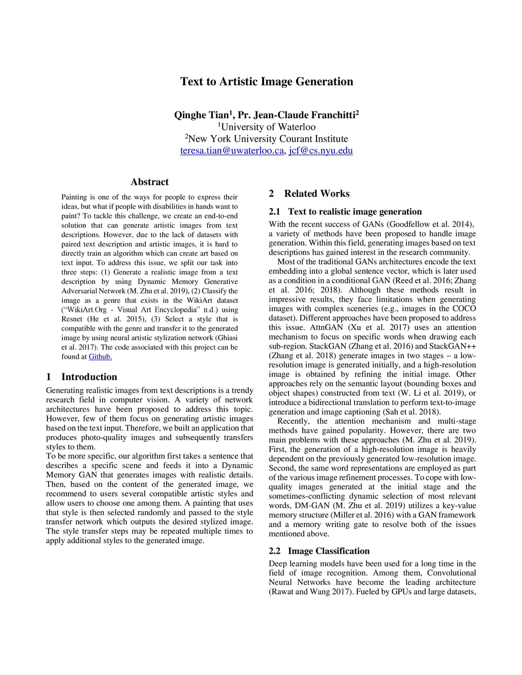 Painting is one of the ways for people to express their ideas, but what if people with disabilities in hands want to paint? To tackle this challenge, we create an end-to-end solution that can generate artistic images from text descriptions. However, due to the lack of datasets with paired text description and artistic images, it is hard to directly train an algorithm which can create art based on text input. To address this issue, we split our task into three steps: (1) Generate a realistic image from a text description by using Dynamic Memory Generative Adversarial Network (arXiv:1904.01310), (2) Classify the image as a genre that exists in the WikiArt dataset using Resnet (arXiv: 1512.03385), (3) Select a style that is compatible with the genre and transfer it to the generated image by using neural artistic stylization network (arXiv:1705.06830).