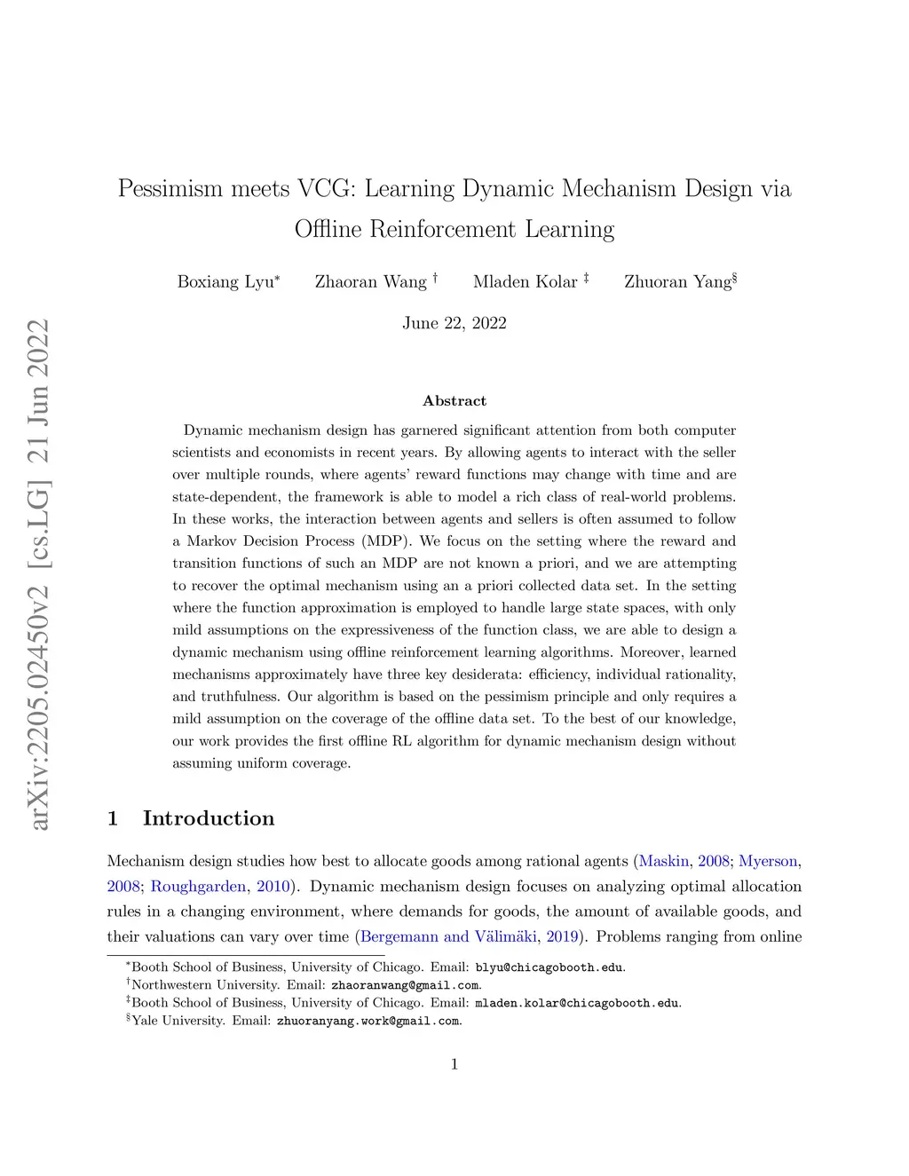 Dynamic mechanism design has garnered significant attention from both computer scientists and economists in recent years. By allowing agents to interact with the seller over multiple rounds, where agents' reward functions may change with time and are state-dependent, the framework is able to model a rich class of real-world problems. In these works, the interaction between agents and sellers is often assumed to follow a Markov Decision Process (MDP). We focus on the setting where the reward and transition functions of such an MDP are not known a priori, and we are attempting to recover the optimal mechanism using an a priori collected data set. In the setting where the function approximation is employed to handle large state spaces, with only mild assumptions on the expressiveness of the function class, we are able to design a dynamic mechanism using offline reinforcement learning algorithms. Moreover, learned mechanisms approximately have three key desiderata: efficiency, individual rationality, and truthfulness. Our algorithm is based on the pessimism principle and only requires a mild assumption on the coverage of the offline data set. To the best of our knowledge, our work provides the first offline RL algorithm for dynamic mechanism design without assuming uniform coverage.