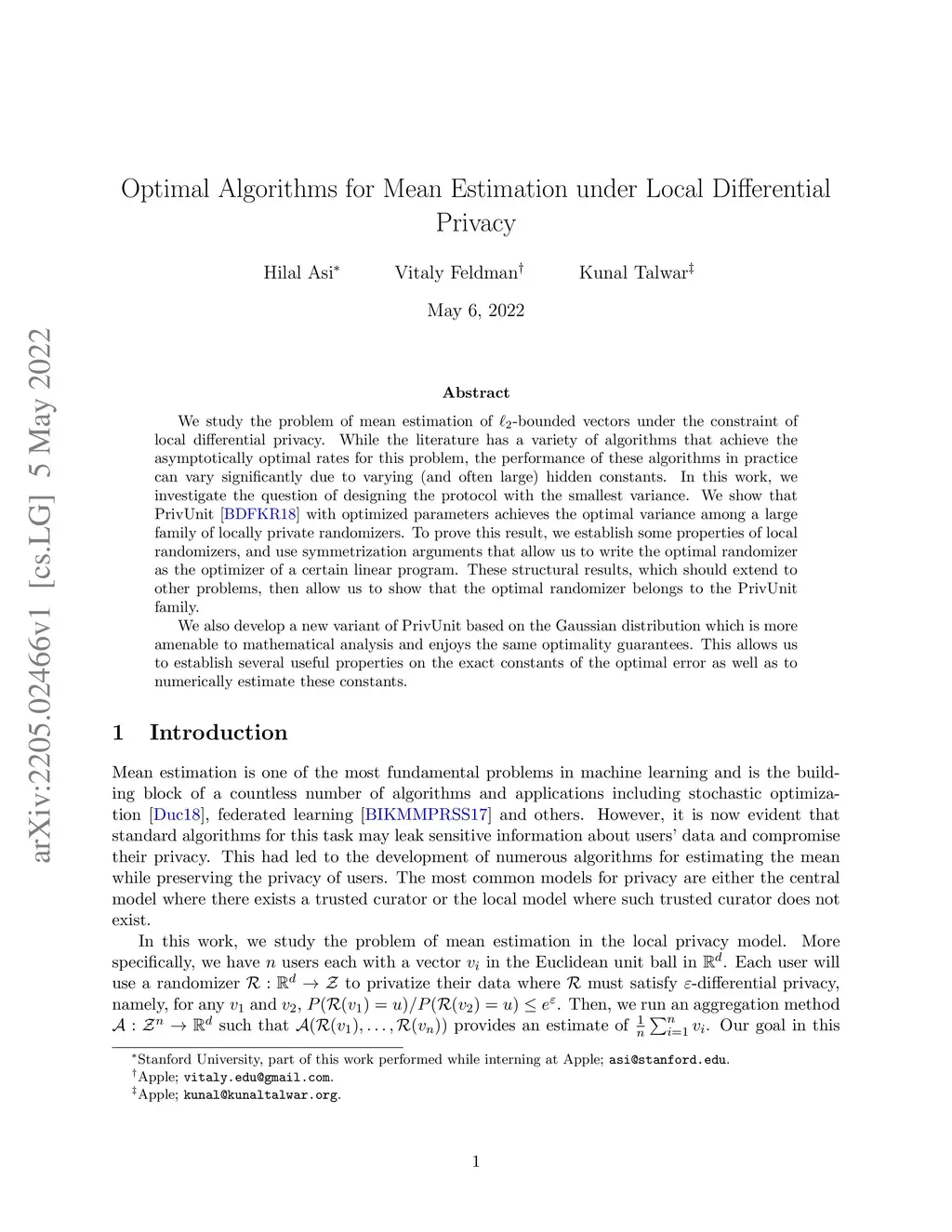 We study the problem of mean estimation of -bounded vectors under the constraint of local differential privacy. While the literature has a variety of algorithms that achieve the asymptotically optimal rates for this problem, the performance of these algorithms in practice can vary significantly due to varying (and often large) hidden constants. In this work, we investigate the question of designing the protocol with the smallest variance. We show that PrivUnit (Bhowmick et al. 2018) with optimized parameters achieves the optimal variance among a large family of locally private randomizers. To prove this result, we establish some properties of local randomizers, and use symmetrization arguments that allow us to write the optimal randomizer as the optimizer of a certain linear program. These structural results, which should extend to other problems, then allow us to show that the optimal randomizer belongs to the PrivUnit family. We also develop a new variant of PrivUnit based on the Gaussian distribution which is more amenable to mathematical analysis and enjoys the same optimality guarantees. This allows us to establish several useful properties on the exact constants of the optimal error as well as to numerically estimate these constants.