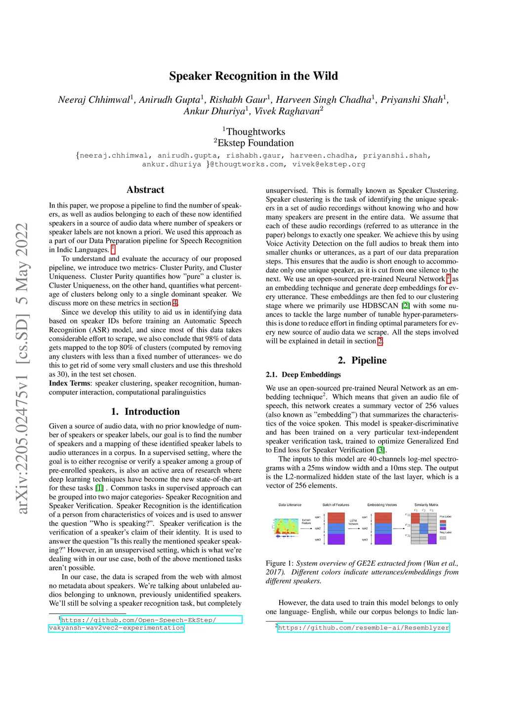 In this paper, we propose a pipeline to find the number of speakers, as well as audios belonging to each of these now identified speakers in a source of audio data where number of speakers or speaker labels are not known a priori. We used this approach as a part of our Data Preparation pipeline for Speech Recognition in Indic Languages (https://github.com/Open-Speech-EkStep/vakyansh-wav2vec2-experimentation). To understand and evaluate the accuracy of our proposed pipeline, we introduce two metrics: Cluster Purity, and Cluster Uniqueness. Cluster Purity quantifies how "pure" a cluster is. Cluster Uniqueness, on the other hand, quantifies what percentage of clusters belong only to a single dominant speaker. We discuss more on these metrics in section \ref{sec:metrics}. Since we develop this utility to aid us in identifying data based on speaker IDs before training an Automatic Speech Recognition (ASR) model, and since most of this data takes considerable effort to scrape, we also conclude that 98\% of data gets mapped to the top 80\% of clusters (computed by removing any clusters with less than a fixed number of utterances -- we do this to get rid of some very small clusters and use this threshold as 30), in the test set chosen.