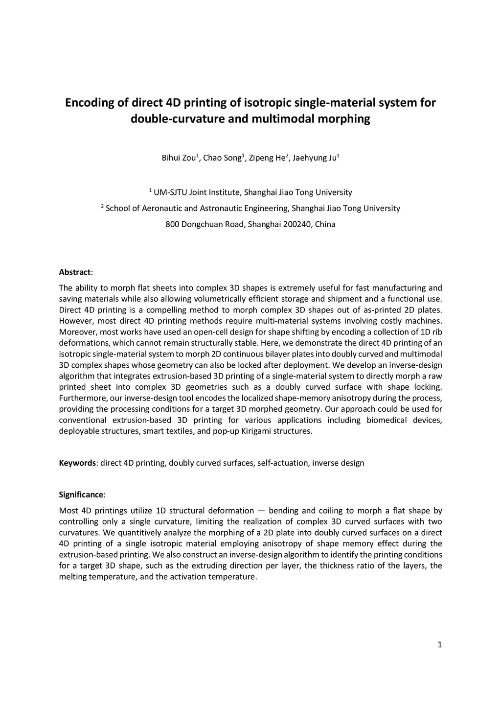 Encoding of direct 4D printing of isotropic single-material system for