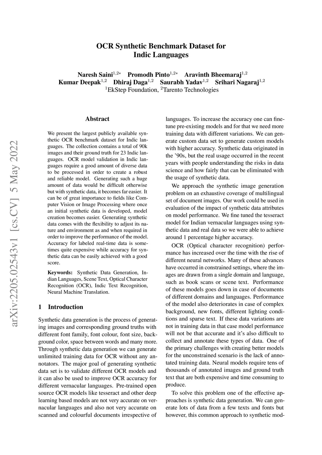 We present the largest publicly available synthetic OCR benchmark dataset for Indic languages. The collection contains a total of 90k images and their ground truth for 23 Indic languages. OCR model validation in Indic languages require a good amount of diverse data to be processed in order to create a robust and reliable model. Generating such a huge amount of data would be difficult otherwise but with synthetic data, it becomes far easier. It can be of great importance to fields like Computer Vision or Image Processing where once an initial synthetic data is developed, model creation becomes easier. Generating synthetic data comes with the flexibility to adjust its nature and environment as and when required in order to improve the performance of the model. Accuracy for labeled real-time data is sometimes quite expensive while accuracy for synthetic data can be easily achieved with a good score.