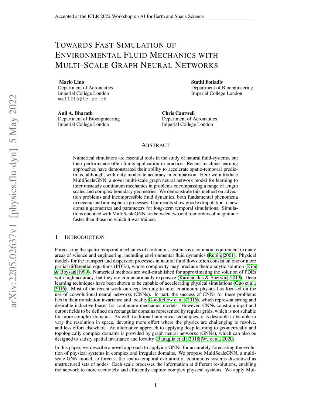 Numerical simulators are essential tools in the study of natural fluid-systems, but their performance often limits application in practice. Recent machine-learning approaches have demonstrated their ability to accelerate spatio-temporal predictions, although, with only moderate accuracy in comparison. Here we introduce MultiScaleGNN, a novel multi-scale graph neural network model for learning to infer unsteady continuum mechanics in problems encompassing a range of length scales and complex boundary geometries. We demonstrate this method on advection problems and incompressible fluid dynamics, both fundamental phenomena in oceanic and atmospheric processes. Our results show good extrapolation to new domain geometries and parameters for long-term temporal simulations. Simulations obtained with MultiScaleGNN are between two and four orders of magnitude faster than those on which it was trained.