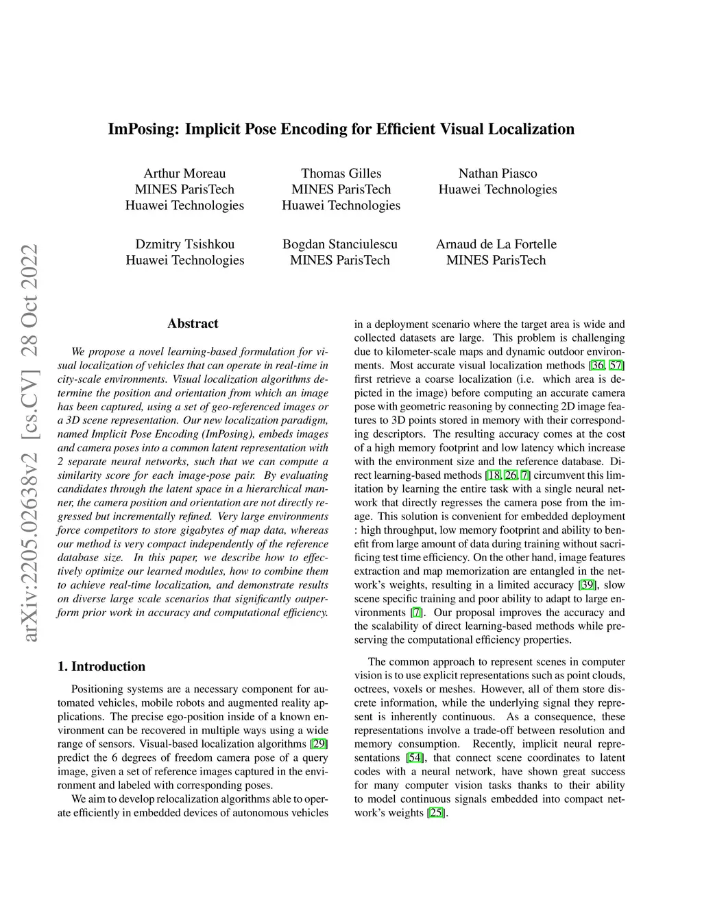 We propose a novel learning-based formulation for visual localization of vehicles that can operate in real-time in city-scale environments. Visual localization algorithms determine the position and orientation from which an image has been captured, using a set of geo-referenced images or a 3D scene representation. Our new localization paradigm, named Implicit Pose Encoding (ImPosing), embeds images and camera poses into a common latent representation with 2 separate neural networks, such that we can compute a similarity score for each image-pose pair. By evaluating candidates through the latent space in a hierarchical manner, the camera position and orientation are not directly regressed but incrementally refined. Very large environments force competitors to store gigabytes of map data, whereas our method is very compact independently of the reference database size. In this paper, we describe how to effectively optimize our learned modules, how to combine them to achieve real-time localization, and demonstrate results on diverse large scale scenarios that significantly outperform prior work in accuracy and computational efficiency.