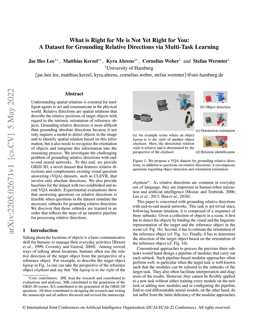 Understanding spatial relations is essential for intelligent agents to act and communicate in the physical world. Relative directions are spatial relations that describe the relative positions of target objects with regard to the intrinsic orientation of reference objects. Grounding relative directions is more difficult than grounding absolute directions because it not only requires a model to detect objects in the image and to identify spatial relation based on this information, but it also needs to recognize the orientation of objects and integrate this information into the reasoning process. We investigate the challenging problem of grounding relative directions with end-to-end neural networks. To this end, we provide GRiD-3D, a novel dataset that features relative directions and complements existing visual question answering (VQA) datasets, such as CLEVR, that involve only absolute directions. We also provide baselines for the dataset with two established end-to-end VQA models. Experimental evaluations show that answering questions on relative directions is feasible when questions in the dataset simulate the necessary subtasks for grounding relative directions. We discover that those subtasks are learned in an order that reflects the steps of an intuitive pipeline for processing relative directions.