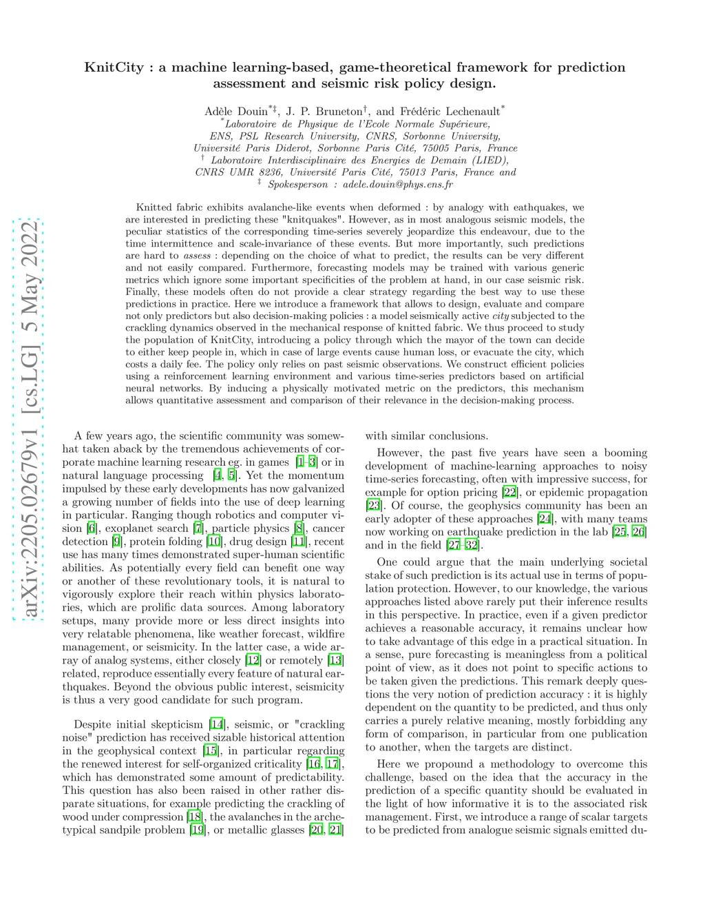 Knitted fabric exhibits avalanche-like events when deformed: by analogy with eathquakes, we are interested in predicting these "knitquakes". However, as in most analogous seismic models, the peculiar statistics of the corresponding time-series severely jeopardize this endeavour, due to the time intermittence and scale-invariance of these events. But more importantly, such predictions are hard to {\it assess}: depending on the choice of what to predict, the results can be very different and not easily compared. Furthermore, forecasting models may be trained with various generic metrics which ignore some important specificities of the problem at hand, in our case seismic risk. Finally, these models often do not provide a clear strategy regarding the best way to use these predictions in practice. Here we introduce a framework that allows to design, evaluate and compare not only predictors but also decision-making policies: a model seismically active {\it city} subjected to the crackling dynamics observed in the mechanical response of knitted fabric. We thus proceed to study the population of KnitCity, introducing a policy through which the mayor of the town can decide to either keep people in, which in case of large events cause human loss, or evacuate the city, which costs a daily fee. The policy only relies on past seismic observations. We construct efficient policies using a reinforcement learning environment and various time-series predictors based on artificial neural networks. By inducing a physically motivated metric on the predictors, this mechanism allows quantitative assessment and comparison of their relevance in the decision-making process.