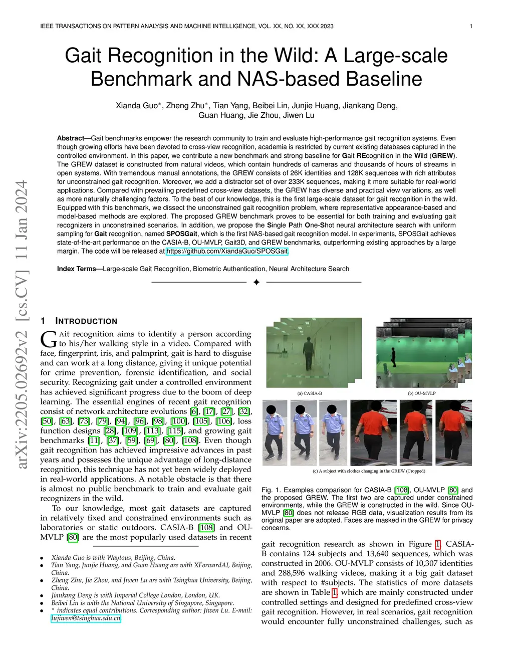 Gait benchmarks empower the research community to train and evaluate high-performance gait recognition systems. Even though growing efforts have been devoted to cross-view recognition, academia is restricted by current existing databases captured in the controlled environment. In this paper, we contribute a new benchmark and strong baseline for Gait REcognition in the Wild (GREW). The GREW dataset is constructed from natural videos, which contain hundreds of cameras and thousands of hours of streams in open systems. With tremendous manual annotations, the GREW consists of 26K identities and 128K sequences with rich attributes for unconstrained gait recognition. Moreover, we add a distractor set of over 233K sequences, making it more suitable for real-world applications. Compared with prevailing predefined cross-view datasets, the GREW has diverse and practical view variations, as well as more naturally challenging factors. To the best of our knowledge, this is the first large-scale dataset for gait recognition in the wild. Equipped with this benchmark, we dissect the unconstrained gait recognition problem, where representative appearance-based and model-based methods are explored. The proposed GREW benchmark proves to be essential for both training and evaluating gait recognizers in unconstrained scenarios. In addition, we propose the Single Path One-Shot neural architecture search with uniform sampling for Gait recognition, named SPOSGait, which is the first NAS-based gait recognition model. In experiments, SPOSGait achieves state-of-the-art performance on the CASIA-B, OU-MVLP, Gait3D, and GREW benchmarks, outperforming existing approaches by a large margin. The code will be released at https://github.com/XiandaGuo/SPOSGait.