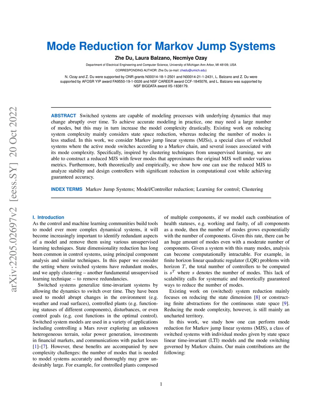Switched systems are capable of modeling processes with underlying dynamics that may change abruptly over time. To achieve accurate modeling in practice, one may need a large number of modes, but this may in turn increase the model complexity drastically. Existing work on reducing system complexity mainly considers state space reduction, yet reducing the number of modes is less studied. In this work, we consider Markov jump linear systems (MJSs), a special class of switched systems where the active mode switches according to a Markov chain, and several issues associated with its mode complexity. Specifically, inspired by clustering techniques from unsupervised learning, we are able to construct a reduced MJS with fewer modes that approximates well the original MJS under various metrics. Furthermore, both theoretically and empirically, we show how one can use the reduced MJS to analyze stability and design controllers with significant reduction in computational cost while achieving guaranteed accuracy.