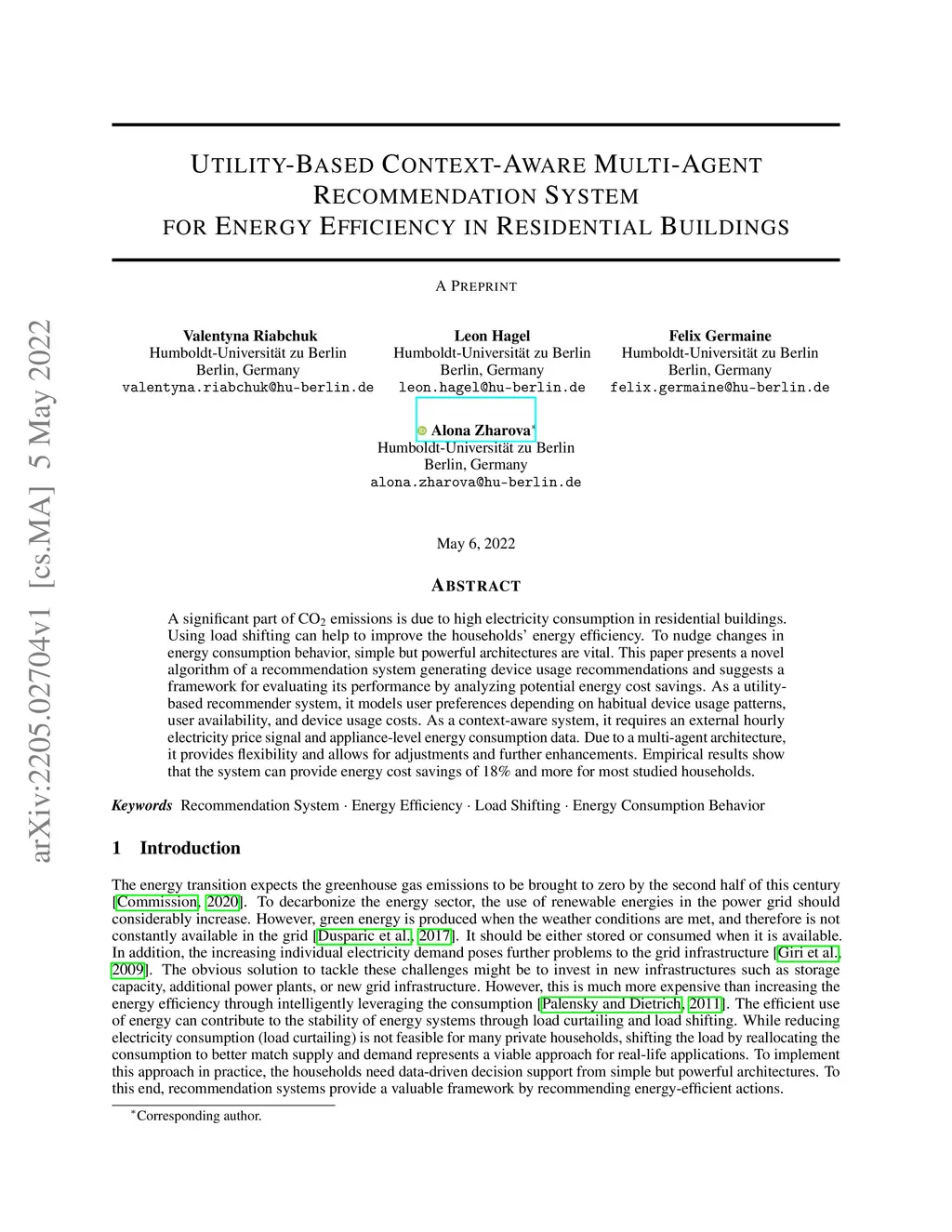 A significant part of CO2 emissions is due to high electricity consumption in residential buildings. Using load shifting can help to improve the households' energy efficiency. To nudge changes in energy consumption behavior, simple but powerful architectures are vital. This paper presents a novel algorithm of a recommendation system generating device usage recommendations and suggests a framework for evaluating its performance by analyzing potential energy cost savings. As a utility-based recommender system, it models user preferences depending on habitual device usage patterns, user availability, and device usage costs. As a context-aware system, it requires an external hourly electricity price signal and appliance-level energy consumption data. Due to a multi-agent architecture, it provides flexibility and allows for adjustments and further enhancements. Empirical results show that the system can provide energy cost savings of 18% and more for most studied households.