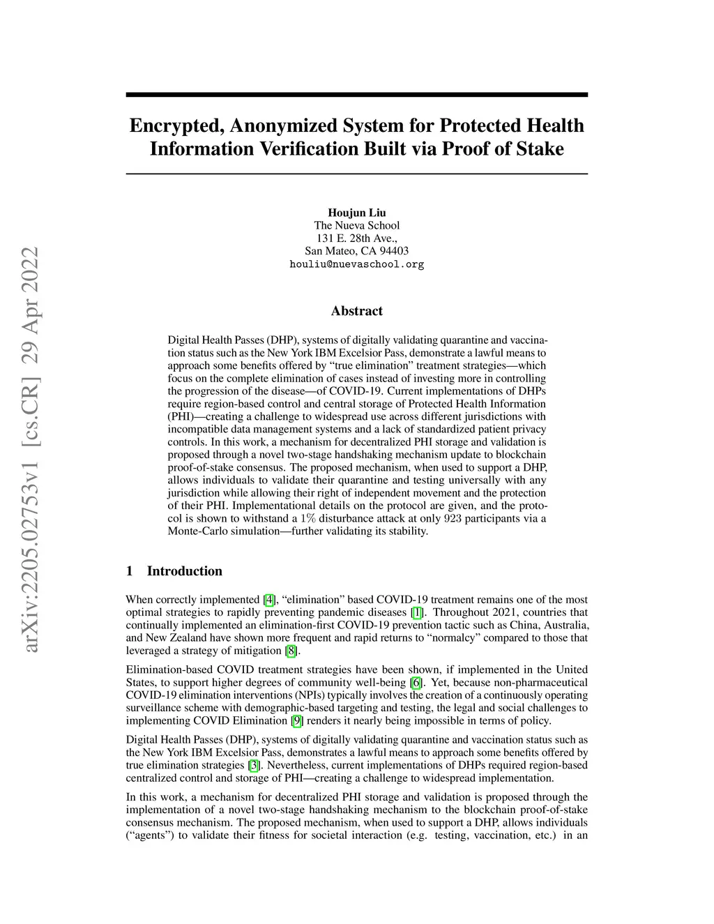 Digital Health Passes (DHP), systems of digitally validating quarantine and vaccination status such as the New York IBM Excelsior Pass, demonstrate a lawful means to approach some benefits offered by "true elimination" treatment strategies-which focus on the complete elimination of cases instead of investing more in controlling the progression of the disease-of COVID-19. Current implementations of DHPs require region-based control and central storage of Protected Health Information (PHI)-creating a challenge to widespread use across different jurisdictions with incompatible data management systems and a lack of standardized patient privacy controls. In this work, a mechanism for decentralized PHI storage and validation is proposed through a novel two-stage handshaking mechanism update to blockchain proof-of-stake consensus. The proposed mechanism, when used to support a DHP, allows individuals to validate their quarantine and testing universally with any jurisdiction while allowing their right of independent movement and the protection of their PHI. Implementational details on the protocol are given, and the protocol is shown to withstand a 1% disturbance attack at only 923 participants via a Monte-Carlo simulation: further validating its stability.