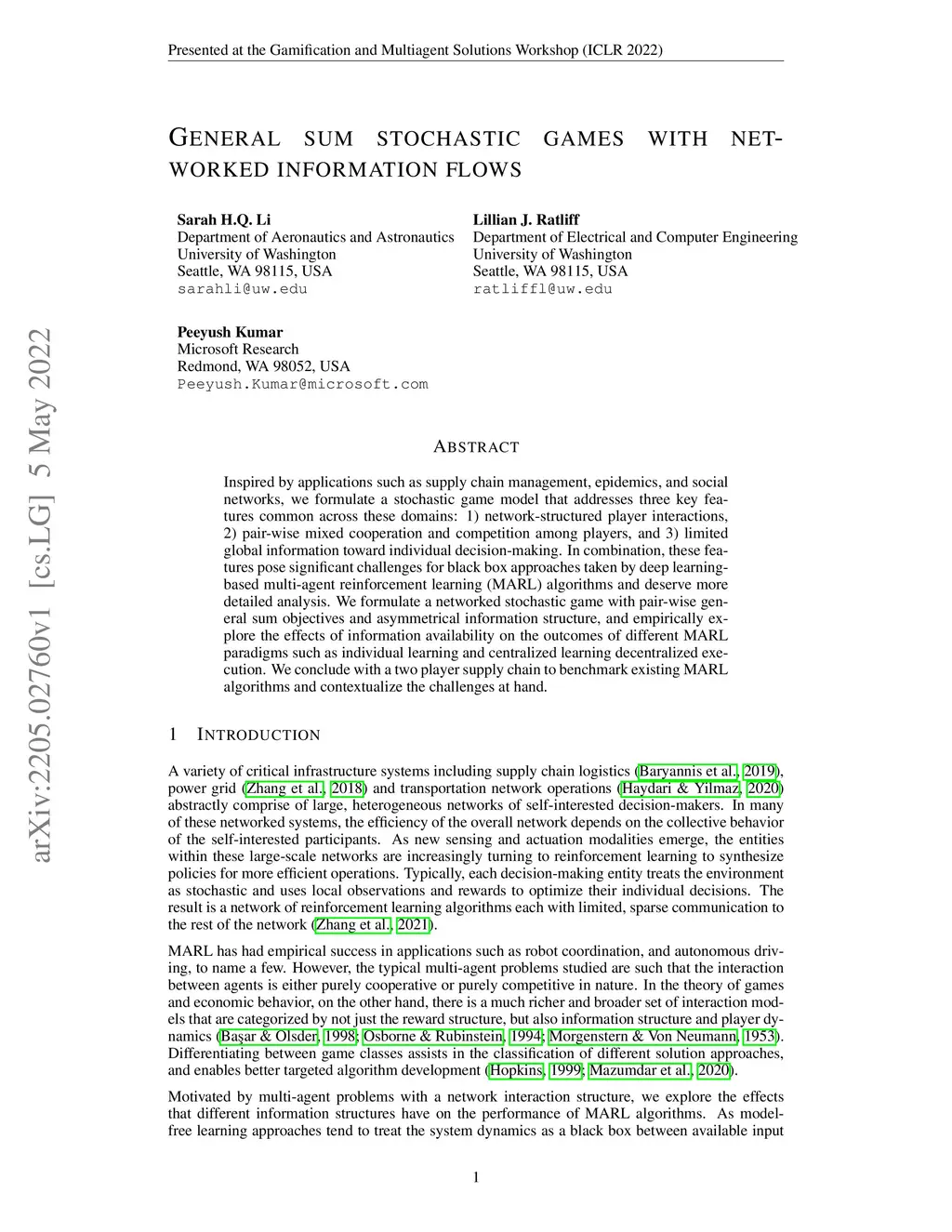 General sum stochastic games with networked information flows