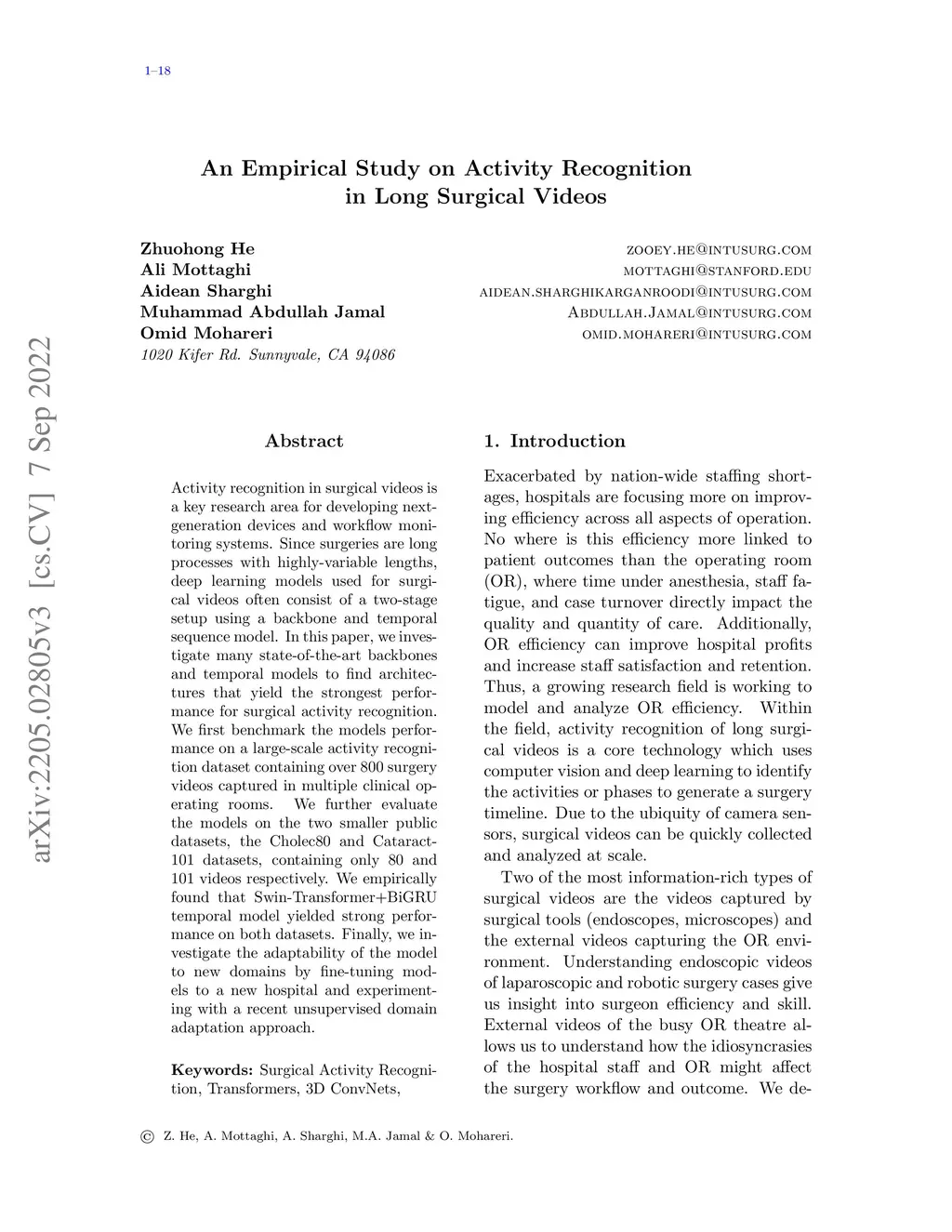 Activity recognition in surgical videos is a key research area for developing next-generation devices and workflow monitoring systems. Since surgeries are long processes with highly-variable lengths, deep learning models used for surgical videos often consist of a two-stage setup using a backbone and temporal sequence model. In this paper, we investigate many state-of-the-art backbones and temporal models to find architectures that yield the strongest performance for surgical activity recognition. We first benchmark the models performance on a large-scale activity recognition dataset containing over 800 surgery videos captured in multiple clinical operating rooms. We further evaluate the models on the two smaller public datasets, the Cholec80 and Cataract-101 datasets, containing only 80 and 101 videos respectively. We empirically found that Swin-Transformer+BiGRU temporal model yielded strong performance on both datasets. Finally, we investigate the adaptability of the model to new domains by fine-tuning models to a new hospital and experimenting with a recent unsupervised domain adaptation approach.