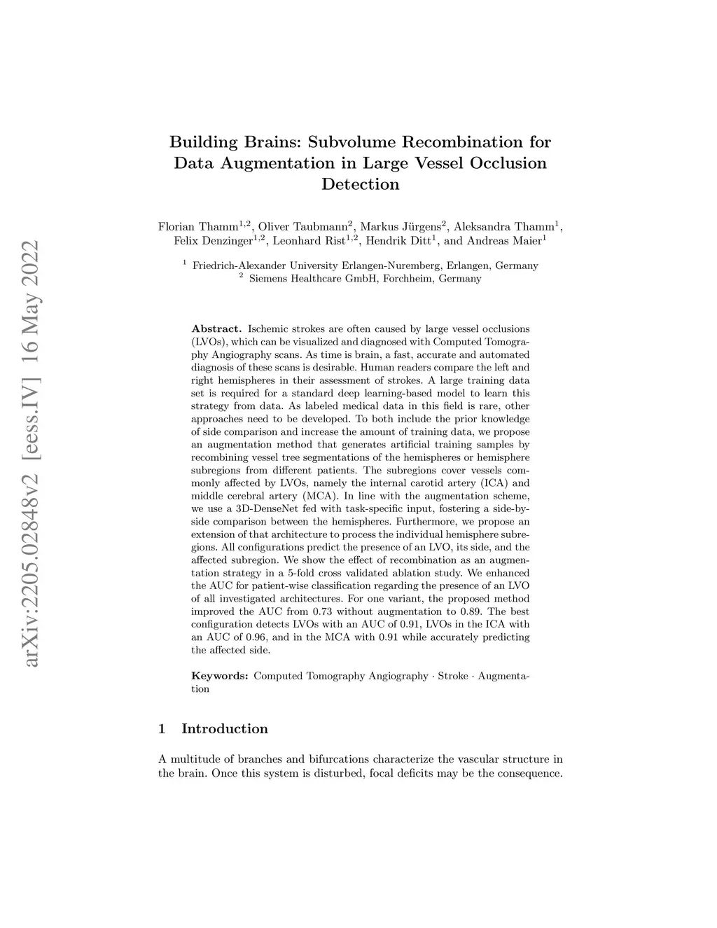 Ischemic strokes are often caused by large vessel occlusions (LVOs), which can be visualized and diagnosed with Computed Tomography Angiography scans. As time is brain, a fast, accurate and automated diagnosis of these scans is desirable. Human readers compare the left and right hemispheres in their assessment of strokes. A large training data set is required for a standard deep learning-based model to learn this strategy from data. As labeled medical data in this field is rare, other approaches need to be developed. To both include the prior knowledge of side comparison and increase the amount of training data, we propose an augmentation method that generates artificial training samples by recombining vessel tree segmentations of the hemispheres or hemisphere subregions from different patients. The subregions cover vessels commonly affected by LVOs, namely the internal carotid artery (ICA) and middle cerebral artery (MCA). In line with the augmentation scheme, we use a 3D-DenseNet fed with task-specific input, fostering a side-by-side comparison between the hemispheres. Furthermore, we propose an extension of that architecture to process the individual hemisphere subregions. All configurations predict the presence of an LVO, its side, and the affected subregion. We show the effect of recombination as an augmentation strategy in a 5-fold cross validated ablation study. We enhanced the AUC for patient-wise classification regarding the presence of an LVO of all investigated architectures. For one variant, the proposed method improved the AUC from 0.73 without augmentation to 0.89. The best configuration detects LVOs with an AUC of 0.91, LVOs in the ICA with an AUC of 0.96, and in the MCA with 0.91 while accurately predicting the affected side.