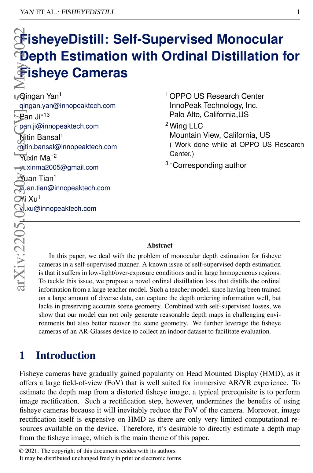 In this paper, we deal with the problem of monocular depth estimation for fisheye cameras in a self-supervised manner. A known issue of self-supervised depth estimation is that it suffers in low-light/over-exposure conditions and in large homogeneous regions. To tackle this issue, we propose a novel ordinal distillation loss that distills the ordinal information from a large teacher model. Such a teacher model, since having been trained on a large amount of diverse data, can capture the depth ordering information well, but lacks in preserving accurate scene geometry. Combined with self-supervised losses, we show that our model can not only generate reasonable depth maps in challenging environments but also better recover the scene geometry. We further leverage the fisheye cameras of an AR-Glasses device to collect an indoor dataset to facilitate evaluation.