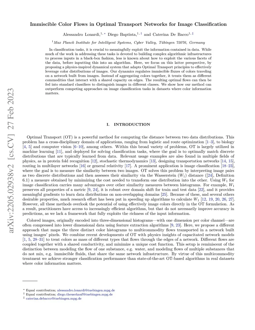In classification tasks, it is crucial to meaningfully exploit the information contained in data. While much of the work in addressing these tasks is devoted to building complex algorithmic infrastructures to process inputs in a black-box fashion, less is known about how to exploit the various facets of the data, before inputting this into an algorithm. Here, we focus on this latter perspective, by proposing a physics-inspired dynamical system that adapts Optimal Transport principles to effectively leverage color distributions of images. Our dynamics regulates immiscible fluxes of colors traveling on a network built from images. Instead of aggregating colors together, it treats them as different commodities that interact with a shared capacity on edges. The resulting optimal flows can then be fed into standard classifiers to distinguish images in different classes. We show how our method can outperform competing approaches on image classification tasks in datasets where color information matters.