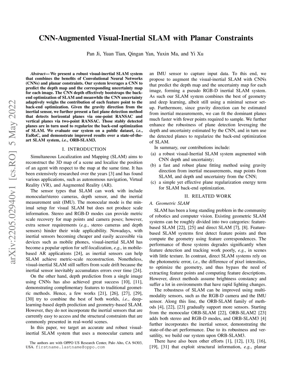 We present a robust visual-inertial SLAM system that combines the benefits of Convolutional Neural Networks (CNNs) and planar constraints. Our system leverages a CNN to predict the depth map and the corresponding uncertainty map for each image. The CNN depth effectively bootstraps the back-end optimization of SLAM and meanwhile the CNN uncertainty adaptively weighs the contribution of each feature point to the back-end optimization. Given the gravity direction from the inertial sensor, we further present a fast plane detection method that detects horizontal planes via one-point RANSAC and vertical planes via two-point RANSAC. Those stably detected planes are in turn used to regularize the back-end optimization of SLAM. We evaluate our system on a public dataset, \ie, EuRoC, and demonstrate improved results over a state-of-the-art SLAM system, \ie, ORB-SLAM3.