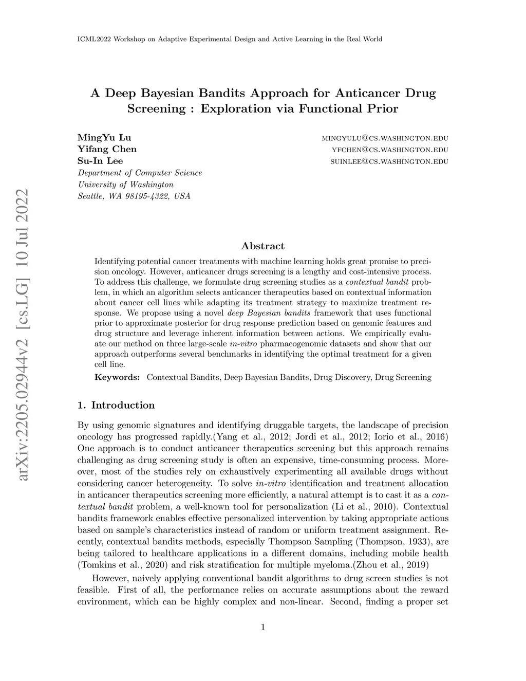 Learning personalized cancer treatment with machine learning holds great promise to improve cancer patients' chance of survival. Despite recent advances in machine learning and precision oncology, this approach remains challenging as collecting data in preclinical/clinical studies for modeling multiple treatment efficacies is often an expensive, time-consuming process. Moreover, the randomization in treatment allocation proves to be suboptimal since some participants/samples are not receiving the most appropriate treatments during the trial. To address this challenge, we formulate drug screening study as a "contextual bandit" problem, in which an algorithm selects anticancer therapeutics based on contextual information about cancer cell lines while adapting its treatment strategy to maximize treatment response in an "online" fashion. We propose using a novel deep Bayesian bandits framework that uses functional prior to approximate posterior for drug response prediction based on multi-modal information consisting of genomic features and drug structure. We empirically evaluate our method on three large-scale in vitro pharmacogenomic datasets and show that our approach outperforms several benchmarks in identifying optimal treatment for a given cell line.
