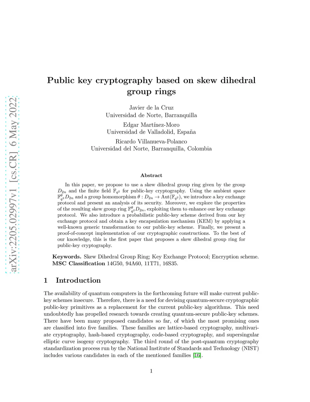 In this paper, we propose to use a skew dihedral group ring given by the group and the finite field for public-key cryptography. Using the ambient space and a group homomorphism , we introduce a key exchange protocol and present an analysis of its security. Moreover, we explore the properties of the resulting skew group ring , exploiting them to enhance our key exchange protocol. We also introduce a probabilistic public-key scheme derived from our key exchange protocol and obtain a key encapsulation mechanism (KEM) by applying a well-known generic transformation to our public-key scheme. Finally, we present a proof-of-concept implementation of our cryptographic constructions. To the best of our knowledge, this is the first paper that proposes a skew dihedral group ring for public-key cryptography.