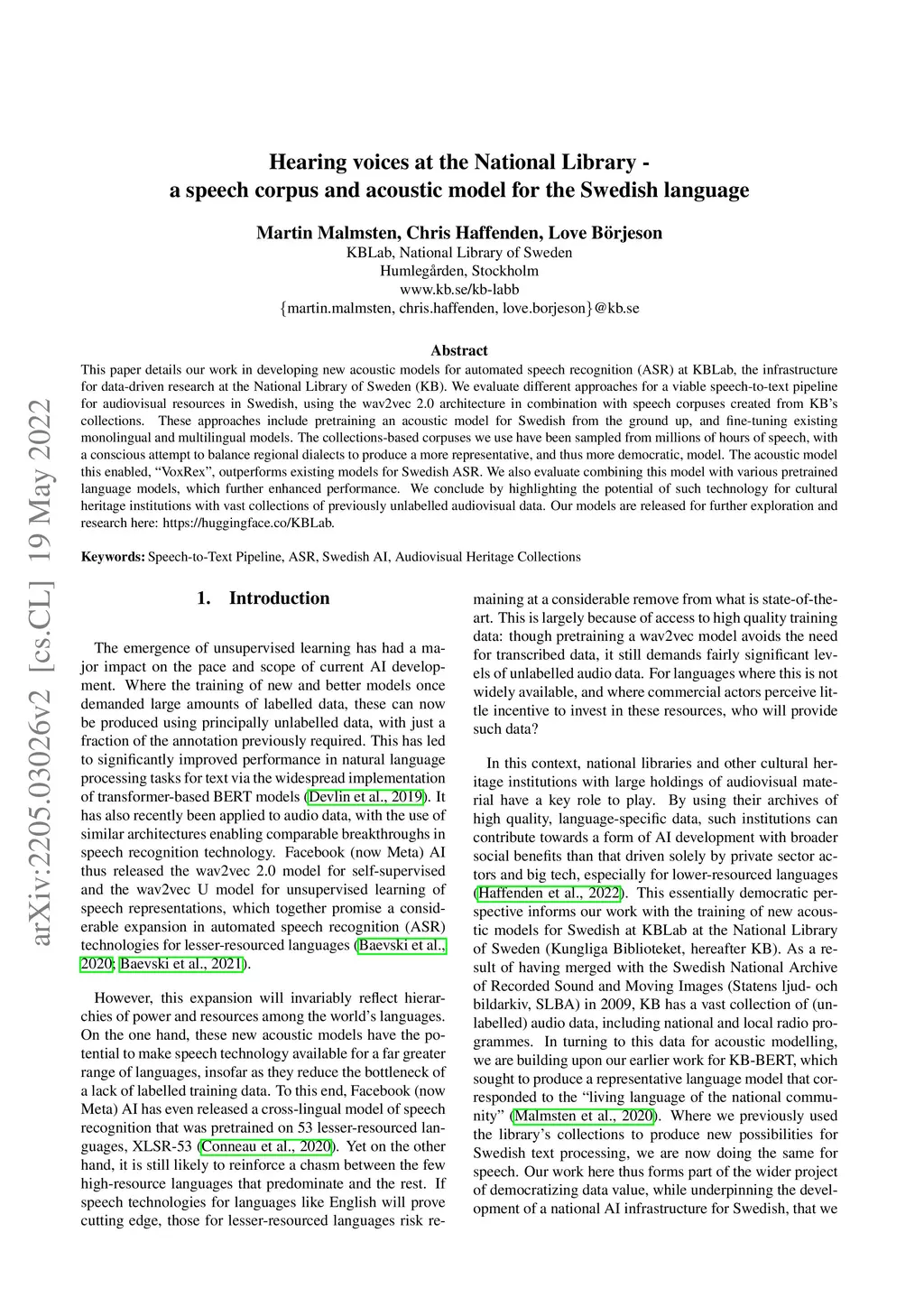 This paper explains our work in developing new acoustic models for automated speech recognition (ASR) at KBLab, the infrastructure for data-driven research at the National Library of Sweden (KB). We evaluate different approaches for a viable speech-to-text pipeline for audiovisual resources in Swedish, using the wav2vec 2.0 architecture in combination with speech corpuses created from KB's collections. These approaches include pretraining an acoustic model for Swedish from the ground up, and fine-tuning existing monolingual and multilingual models. The collections-based corpuses we use have been sampled from millions of hours of speech, with a conscious attempt to balance regional dialects to produce a more representative, and thus more democratic, model. The acoustic model this enabled, "VoxRex", outperforms existing models for Swedish ASR. We also evaluate combining this model with various pretrained language models, which further enhanced performance. We conclude by highlighting the potential of such technology for cultural heritage institutions with vast collections of previously unlabelled audiovisual data. Our models are released for further exploration and research here: https://huggingface.co/KBLab.