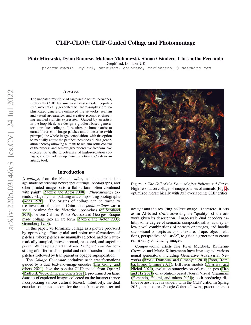 The unabated mystique of large-scale neural networks, such as the CLIP dual image-and-text encoder, popularized automatically generated art. Increasingly more sophisticated generators enhanced the artworks' realism and visual appearance, and creative prompt engineering enabled stylistic expression. Guided by an artist-in-the-loop ideal, we design a gradient-based generator to produce collages. It requires the human artist to curate libraries of image patches and to describe (with prompts) the whole image composition, with the option to manually adjust the patches' positions during generation, thereby allowing humans to reclaim some control of the process and achieve greater creative freedom. We explore the aesthetic potentials of high-resolution collages, and provide an open-source Google Colab as an artistic tool.