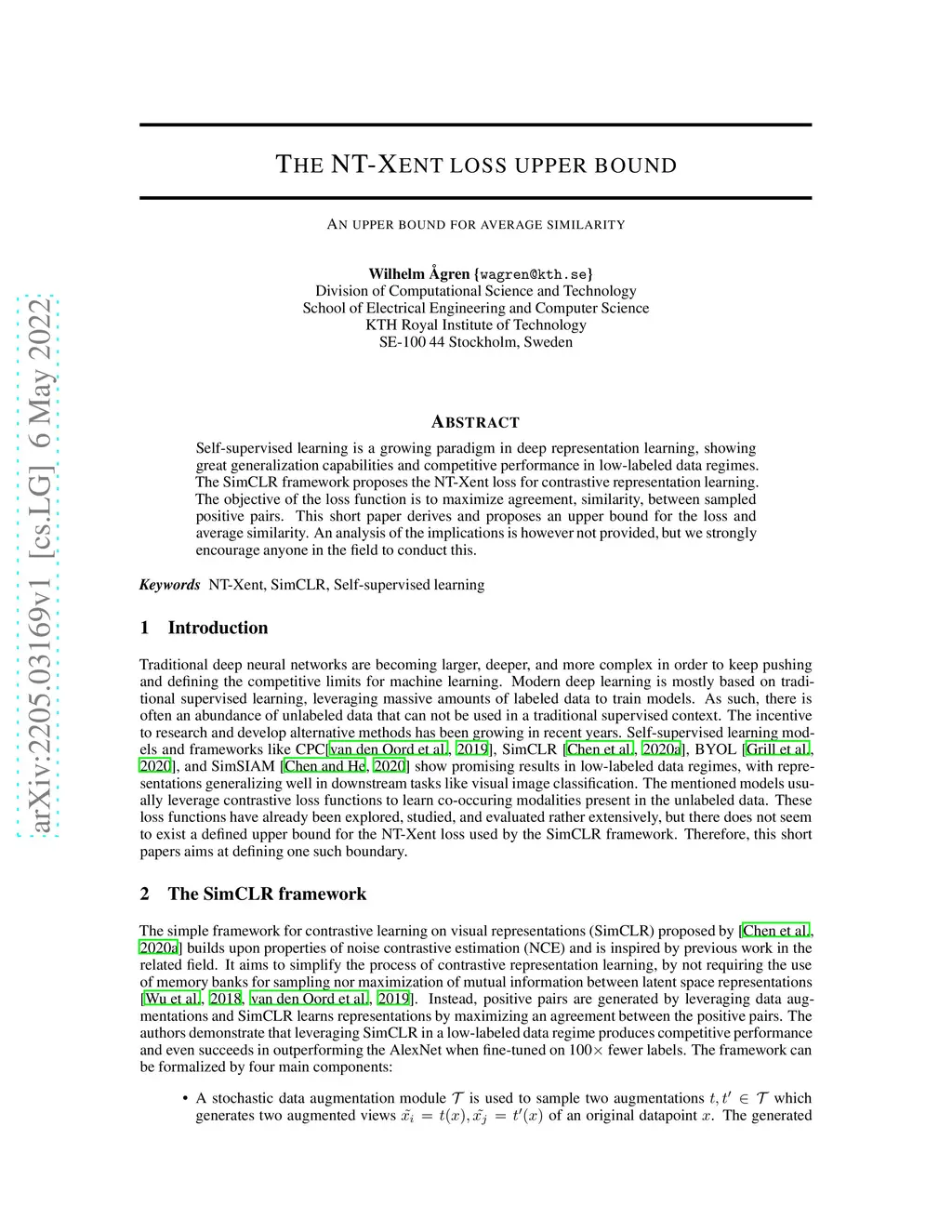 Self-supervised learning is a growing paradigm in deep representation learning, showing great generalization capabilities and competitive performance in low-labeled data regimes. The SimCLR framework proposes the NT-Xent loss for contrastive representation learning. The objective of the loss function is to maximize agreement, similarity, between sampled positive pairs. This short paper derives and proposes an upper bound for the loss and average similarity. An analysis of the implications is however not provided, but we strongly encourage anyone in the field to conduct this.