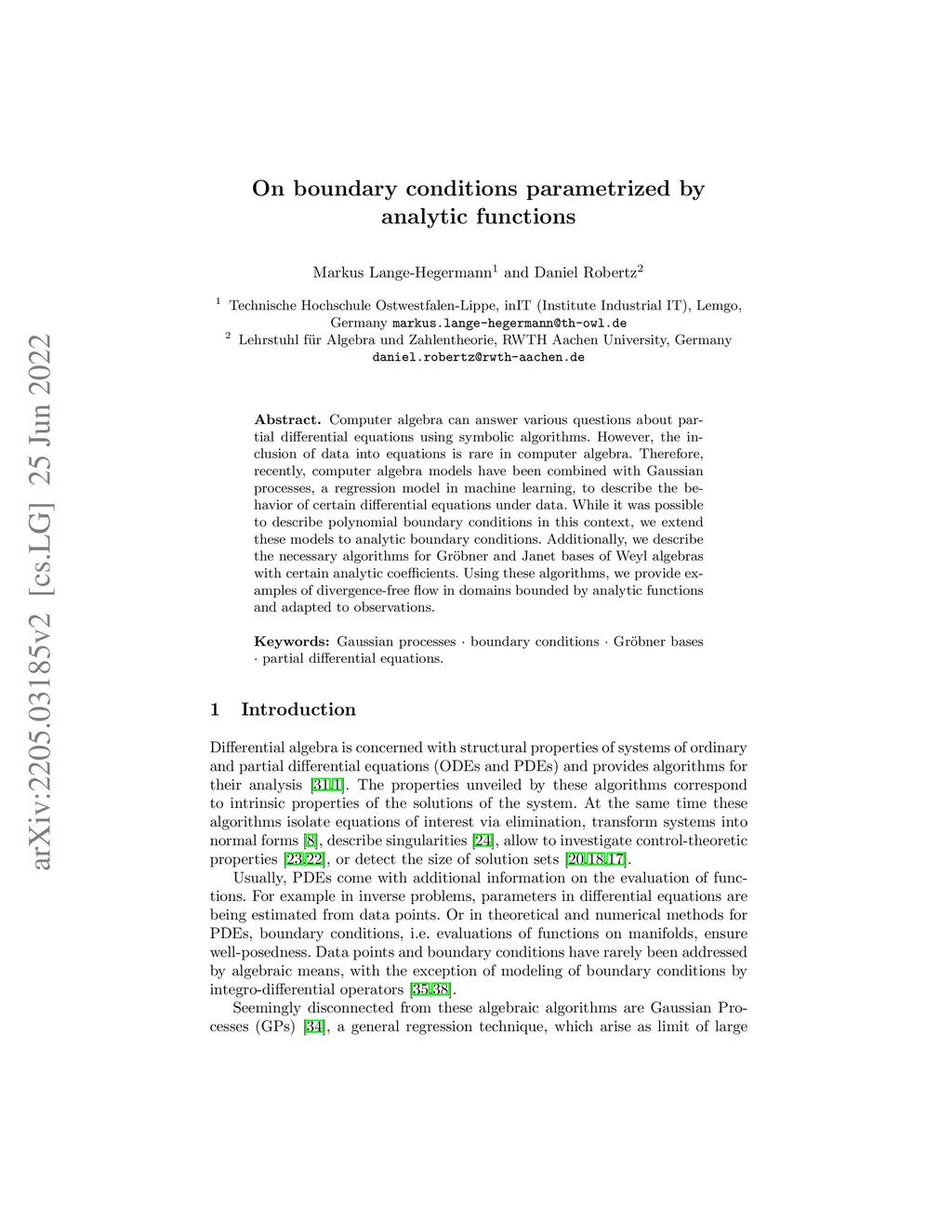 Computer algebra can answer various questions about partial differential equations using symbolic algorithms. However, the inclusion of data into equations is rare in computer algebra. Therefore, recently, computer algebra models have been combined with Gaussian processes, a regression model in machine learning, to describe the behavior of certain differential equations under data. While it was possible to describe polynomial boundary conditions in this context, we extend these models to analytic boundary conditions. Additionally, we describe the necessary algorithms for Gr\"obner and Janet bases of Weyl algebras with certain analytic coefficients. Using these algorithms, we provide examples of divergence-free flow in domains bounded by analytic functions and adapted to observations.