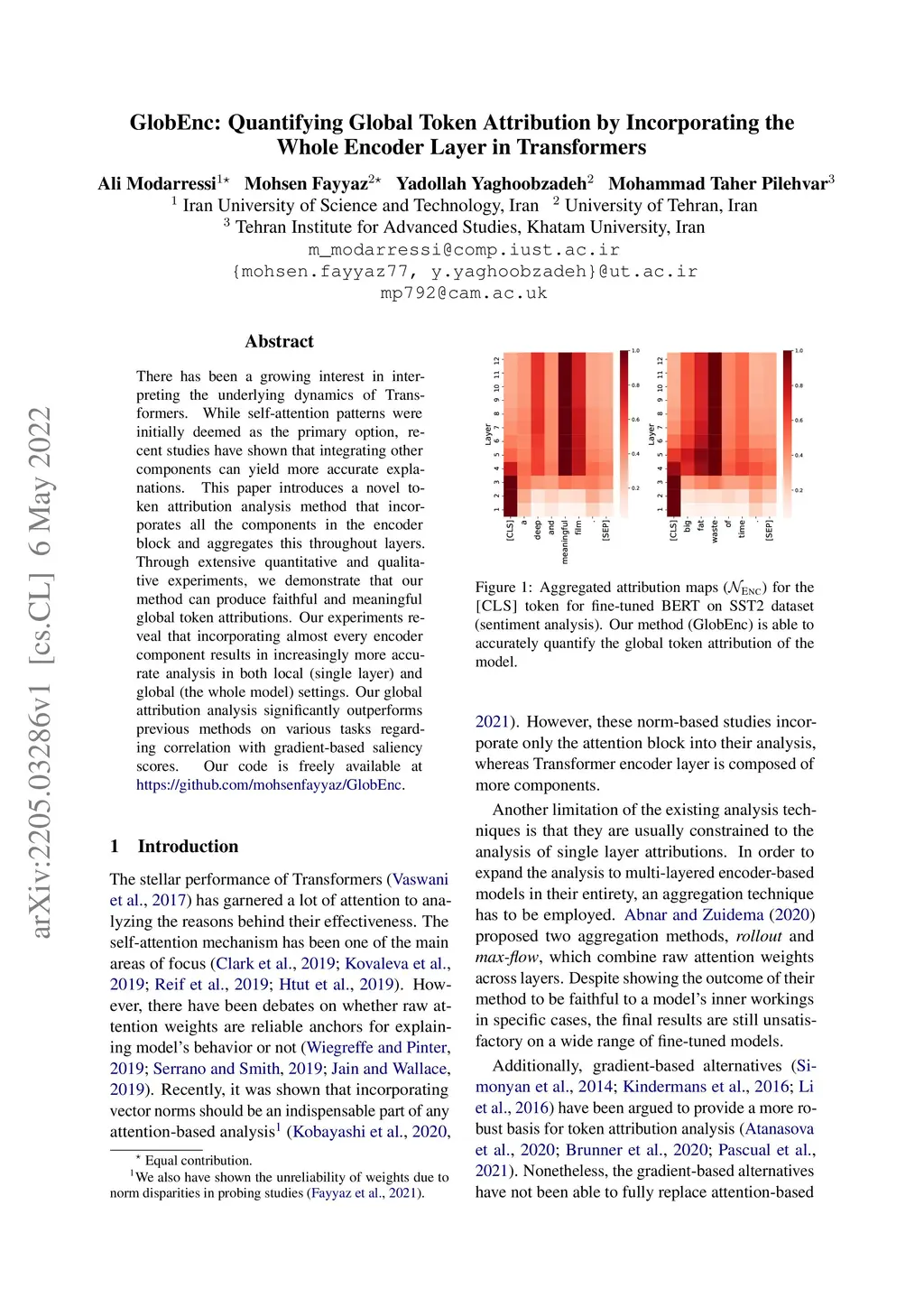There has been a growing interest in interpreting the underlying dynamics of Transformers. While self-attention patterns were initially deemed as the primary option, recent studies have shown that integrating other components can yield more accurate explanations. This paper introduces a novel token attribution analysis method that incorporates all the components in the encoder block and aggregates this throughout layers. Through extensive quantitative and qualitative experiments, we demonstrate that our method can produce faithful and meaningful global token attributions. Our experiments reveal that incorporating almost every encoder component results in increasingly more accurate analysis in both local (single layer) and global (the whole model) settings. Our global attribution analysis significantly outperforms previous methods on various tasks regarding correlation with gradient-based saliency scores. Our code is freely available at https://github.com/mohsenfayyaz/GlobEnc.