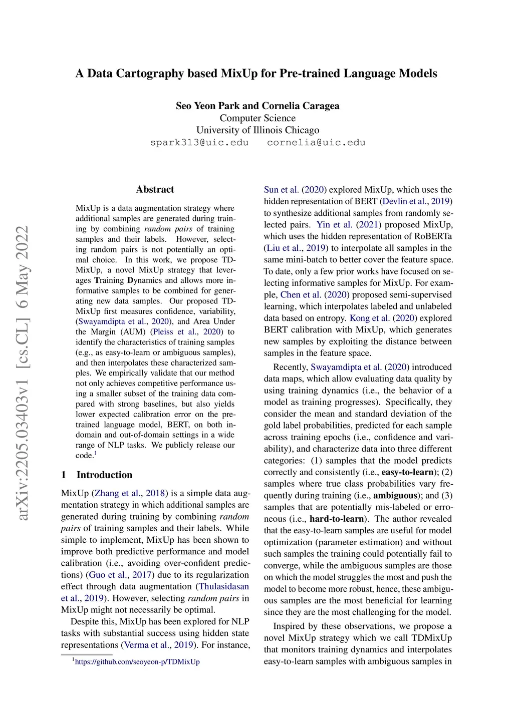 MixUp is a data augmentation strategy where additional samples are generated during training by combining random pairs of training samples and their labels. However, selecting random pairs is not potentially an optimal choice. In this work, we propose TDMixUp, a novel MixUp strategy that leverages Training Dynamics and allows more informative samples to be combined for generating new data samples. Our proposed TDMixUp first measures confidence, variability, (Swayamdipta et al., 2020), and Area Under the Margin (AUM) (Pleiss et al., 2020) to identify the characteristics of training samples (e.g., as easy-to-learn or ambiguous samples), and then interpolates these characterized samples. We empirically validate that our method not only achieves competitive performance using a smaller subset of the training data compared with strong baselines, but also yields lower expected calibration error on the pre-trained language model, BERT, on both in-domain and out-of-domain settings in a wide range of NLP tasks. We publicly release our code.