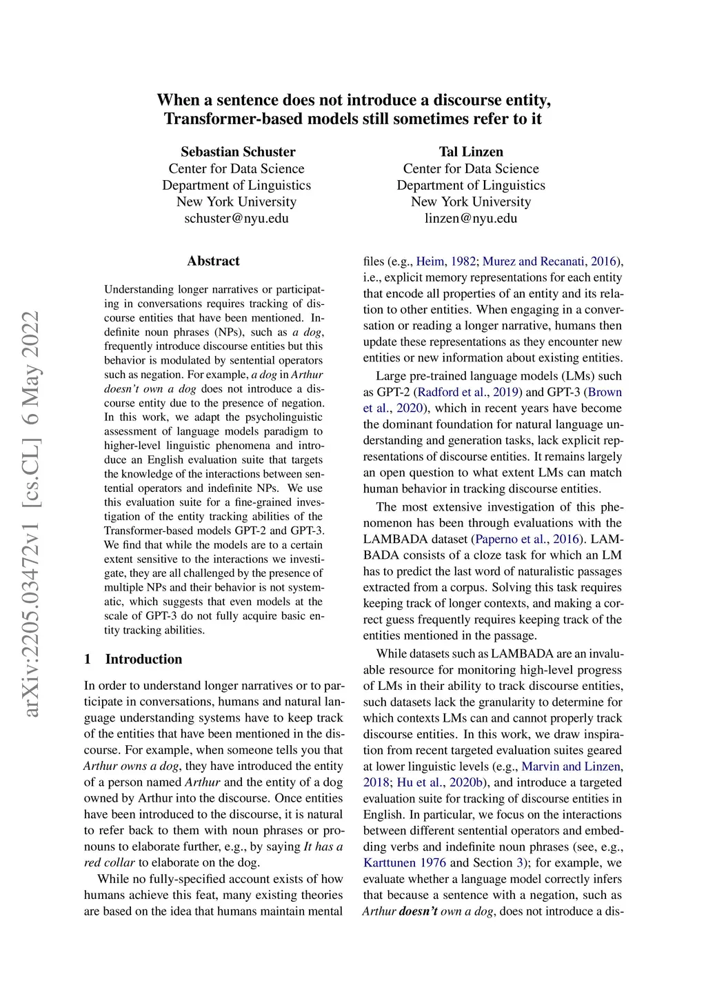 Understanding longer narratives or participating in conversations requires tracking of discourse entities that have been mentioned. Indefinite noun phrases (NPs), such as á dog', frequently introduce discourse entities but this behavior is modulated by sentential operators such as negation. For example, á dog' in Árthur doesn't own a dog' does not introduce a discourse entity due to the presence of negation. In this work, we adapt the psycholinguistic assessment of language models paradigm to higher-level linguistic phenomena and introduce an English evaluation suite that targets the knowledge of the interactions between sentential operators and indefinite NPs. We use this evaluation suite for a fine-grained investigation of the entity tracking abilities of the Transformer-based models GPT-2 and GPT-3. We find that while the models are to a certain extent sensitive to the interactions we investigate, they are all challenged by the presence of multiple NPs and their behavior is not systematic, which suggests that even models at the scale of GPT-3 do not fully acquire basic entity tracking abilities.