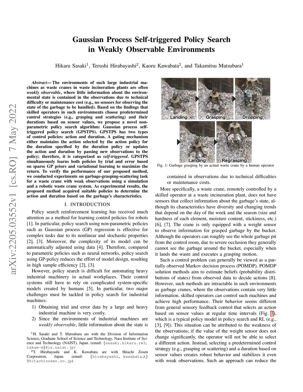 The environments of such large industrial machines as waste cranes in waste incineration plants are often weakly observable, where little information about the environmental state is contained in the observations due to technical difficulty or maintenance cost (e.g., no sensors for observing the state of the garbage to be handled). Based on the findings that skilled operators in such environments choose predetermined control strategies (e.g., grasping and scattering) and their durations based on sensor values, %thereby improving the robustness of their actions, we propose a novel non-parametric policy search algorithm: Gaussian process self-triggered policy search (GPSTPS). GPSTPS has two types of control policies: action and duration. A gating mechanism either maintains the action selected by the action policy for the duration specified by the duration policy or updates the action and duration by passing new observations to the policy; therefore, it is categorized as self-triggered. GPSTPS simultaneously learns both policies by trial and error based on sparse GP priors and variational learning to maximize the return. To verify the performance of our proposed method, we conducted experiments on garbage-grasping-scattering task for a waste crane with weak observations using a simulation and a robotic waste crane system. As experimental results, the proposed method acquired suitable policies to determine the action and duration based on the garbage's characteristics.