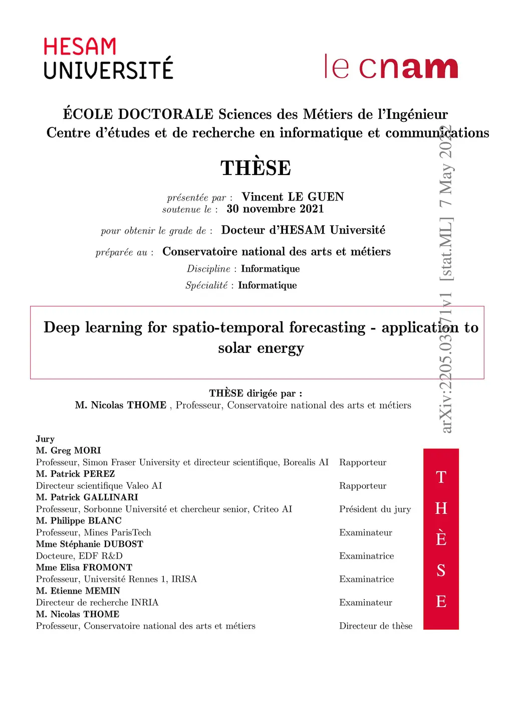 This thesis tackles the subject of spatio-temporal forecasting with deep learning. The motivating application at Electricity de France (EDF) is short-term solar energy forecasting with fisheye images. We explore two main research directions for improving deep forecasting methods by injecting external physical knowledge. The first direction concerns the role of the training loss function. We show that differentiable shape and temporal criteria can be leveraged to improve the performances of existing models. We address both the deterministic context with the proposed DILATE loss function and the probabilistic context with the STRIPE model. Our second direction is to augment incomplete physical models with deep data-driven networks for accurate forecasting. For video prediction, we introduce the PhyDNet model that disentangles physical dynamics from residual information necessary for prediction, such as texture or details. We further propose a learning framework (APHYNITY) that ensures a principled and unique linear decomposition between physical and data-driven components under mild assumptions, leading to better forecasting performances and parameter identification.