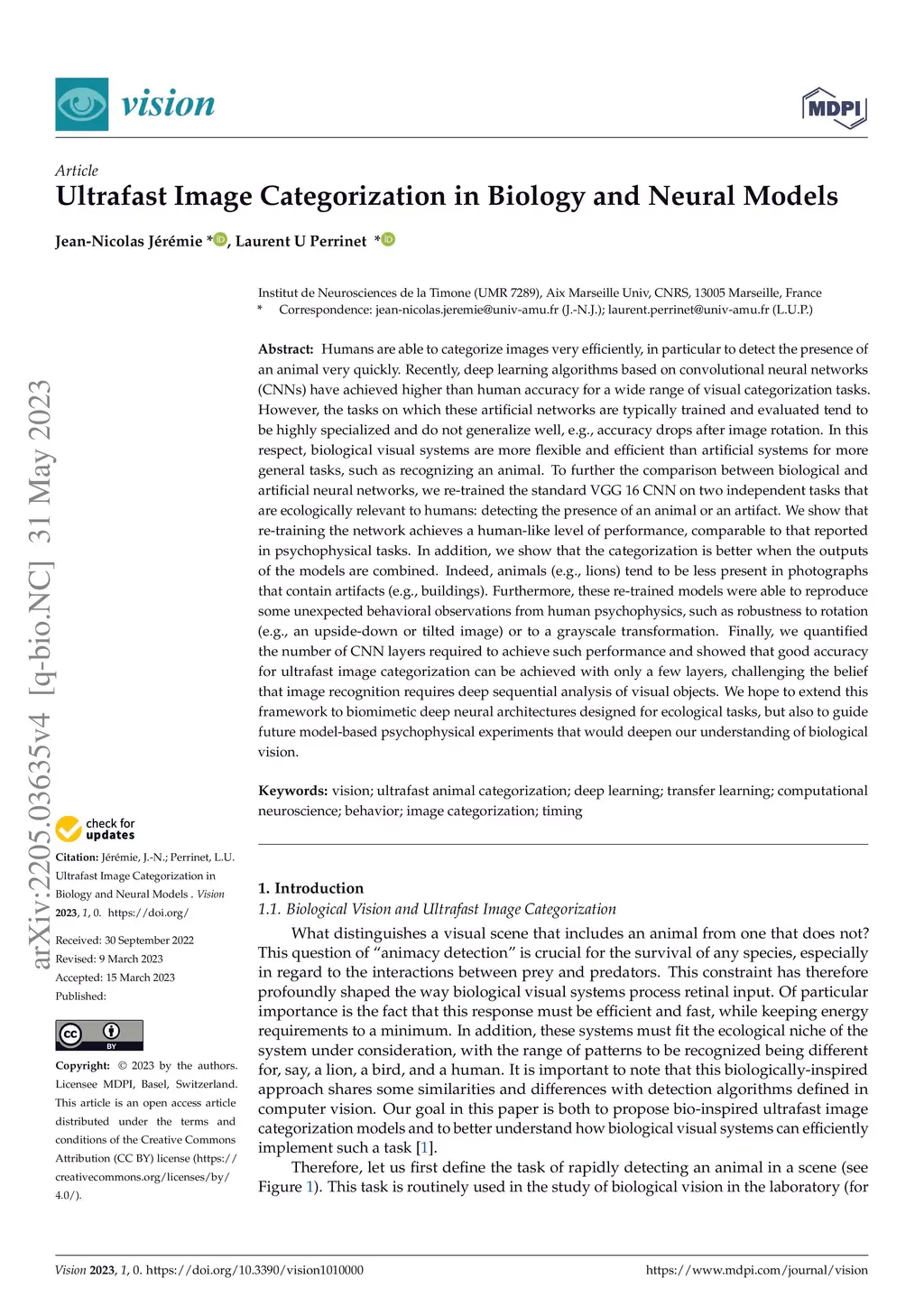 Humans are able to categorize images very efficiently, in particular to detect the presence of an animal very quickly. Recently, deep learning algorithms based on convolutional neural networks (CNNs) have achieved higher than human accuracy for a wide range of visual categorization tasks. However, the tasks on which these artificial networks are typically trained and evaluated tend to be highly specialized and do not generalize well, e.g., accuracy drops after image rotation. In this respect, biological visual systems are more flexible and efficient than artificial systems for more general tasks, such as recognizing an animal. To further the comparison between biological and artificial neural networks, we re-trained the standard VGG 16 CNN on two independent tasks that are ecologically relevant to humans: detecting the presence of an animal or an artifact. We show that re-training the network achieves a human-like level of performance, comparable to that reported in psychophysical tasks. In addition, we show that the categorization is better when the outputs of the models are combined. Indeed, animals (e.g., lions) tend to be less present in photographs that contain artifacts (e.g., buildings). Furthermore, these re-trained models were able to reproduce some unexpected behavioral observations from human psychophysics, such as robustness to rotation (e.g., an upside-down or tilted image) or to a grayscale transformation. Finally, we quantified the number of CNN layers required to achieve such performance and showed that good accuracy for ultrafast image categorization can be achieved with only a few layers, challenging the belief that image recognition requires deep sequential analysis of visual objects.
