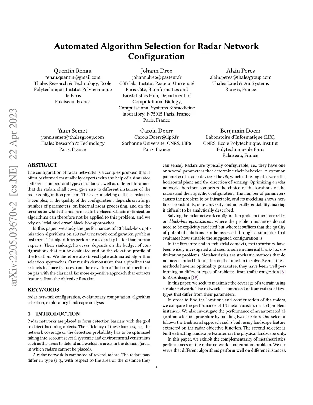 The configuration of radar networks is a complex problem that is often performed manually by experts with the help of a simulator. Different numbers and types of radars as well as different locations that the radars shall cover give rise to different instances of the radar configuration problem. The exact modeling of these instances is complex, as the quality of the configurations depends on a large number of parameters, on internal radar processing, and on the terrains on which the radars need to be placed. Classic optimization algorithms can therefore not be applied to this problem, and we rely on "trial-and-error" black-box approaches. In this paper, we study the performances of 13~black-box optimization algorithms on 153~radar network configuration problem instances. The algorithms perform considerably better than human experts. Their ranking, however, depends on the budget of configurations that can be evaluated and on the elevation profile of the location. We therefore also investigate automated algorithm selection approaches. Our results demonstrate that a pipeline that extracts instance features from the elevation of the terrain performs on par with the classical, far more expensive approach that extracts features from the objective function.