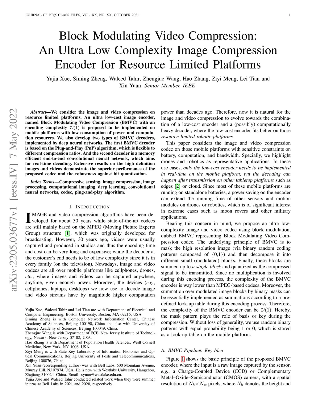 We consider the image and video compression on resource limited platforms. An ultra low-cost image encoder, named Block Modulating Video Compression (BMVC) with an encoding complexity is proposed to be implemented on mobile platforms with low consumption of power and computation resources. We also develop two types of BMVC decoders, implemented by deep neural networks. The first BMVC decoder is based on the Plug-and-Play (PnP) algorithm, which is flexible to different compression ratios. And the second decoder is a memory efficient end-to-end convolutional neural network, which aims for real-time decoding. Extensive results on the high definition images and videos demonstrate the superior performance of the proposed codec and the robustness against bit quantization.