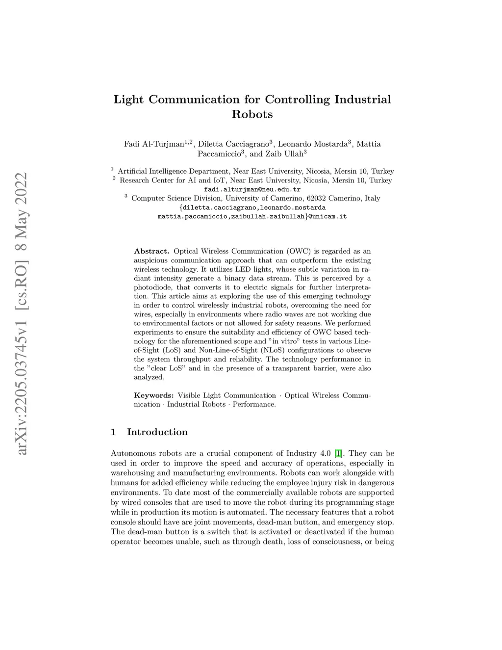 Optical Wireless Communication (OWC) is regarded as an auspicious communication approach that can outperform the existing wireless technology. It utilizes LED lights, whose subtle variation in radiant intensity generate a binary data stream. This is perceived by a photodiode, that converts it to electric signals for further interpretation. This article aims at exploring the use of this emerging technology in order to control wirelessly industrial robots, overcoming the need for wires, especially in environments where radio waves are not working due to environmental factors or not allowed for safety reasons. We performed experiments to ensure the suitability and efficiency of OWC based technology for the aforementioned scope and "in vitro" tests in various Line-of-Sight (LoS) and Non-Line-of-Sight (NLoS) configurations to observe the system throughput and reliability. The technology performance in the "clear LoS" and in the presence of a transparent barrier, were also analyzed.
