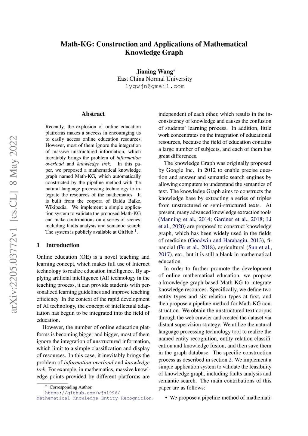 Recently, the explosion of online education platforms makes a success in encouraging us to easily access online education resources. However, most of them ignore the integration of massive unstructured information, which inevitably brings the problem of \textit{information overload} and \textit{knowledge trek}. In this paper, we proposed a mathematical knowledge graph named Math-KG, which automatically constructed by the pipeline method with the natural language processing technology to integrate the resources of the mathematics. It is built from the corpora of Baidu Baike, Wikipedia. We implement a simple application system to validate the proposed Math-KG can make contributions on a series of scenes, including faults analysis and semantic search. The system is publicly available at GitHub \footnote{\url{https://github.com/wjn1996/Mathematical-Knowledge-Entity-Recognition}.}.