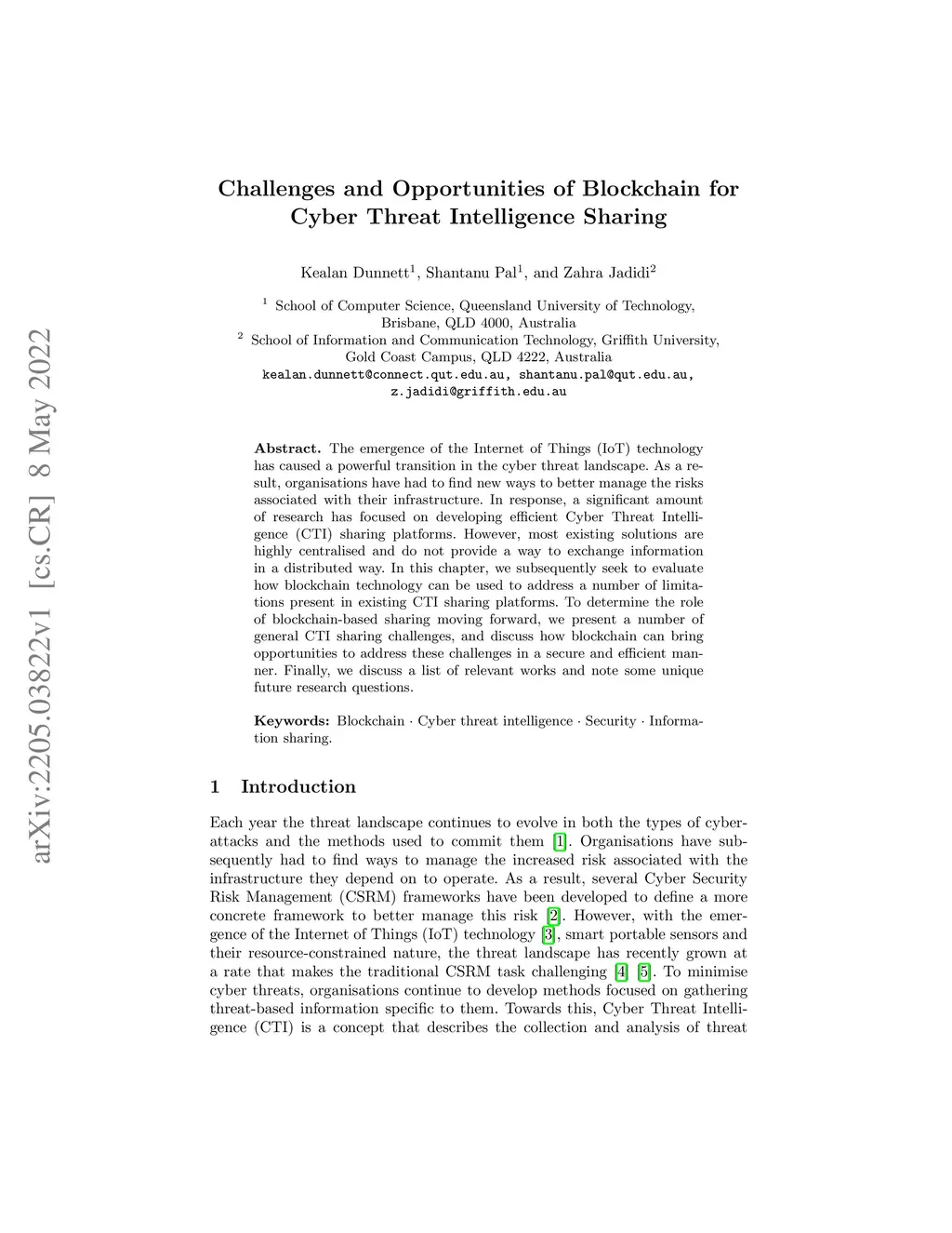 The emergence of the Internet of Things (IoT) technology has caused a powerful transition in the cyber threat landscape. As a result, organisations have had to find new ways to better manage the risks associated with their infrastructure. In response, a significant amount of research has focused on developing efficient Cyber Threat Intelligence (CTI) sharing platforms. However, most existing solutions are highly centralised and do not provide a way to exchange information in a distributed way. In this chapter, we subsequently seek to evaluate how blockchain technology can be used to address a number of limitations present in existing CTI sharing platforms. To determine the role of blockchain-based sharing moving forward, we present a number of general CTI sharing challenges, and discuss how blockchain can bring opportunities to address these challenges in a secure and efficient manner. Finally, we discuss a list of relevant works and note some unique future research questions.