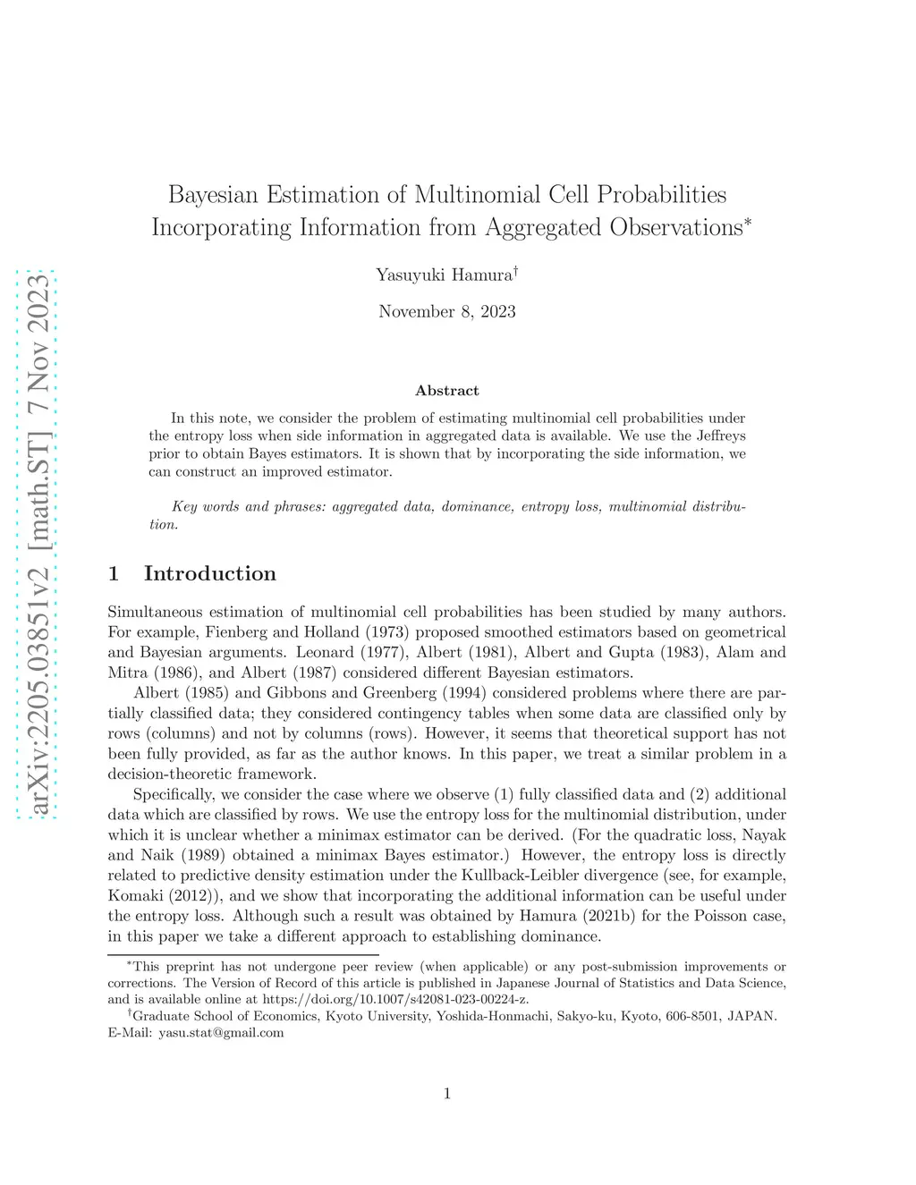 In this note, we consider the problem of estimating multinomial cell probabilities under the entropy loss when side information in aggregated data is available. We use the Jeffreys prior to obtain Bayes estimators. It is shown that by incorporating the side information, we can construct an improved estimator.