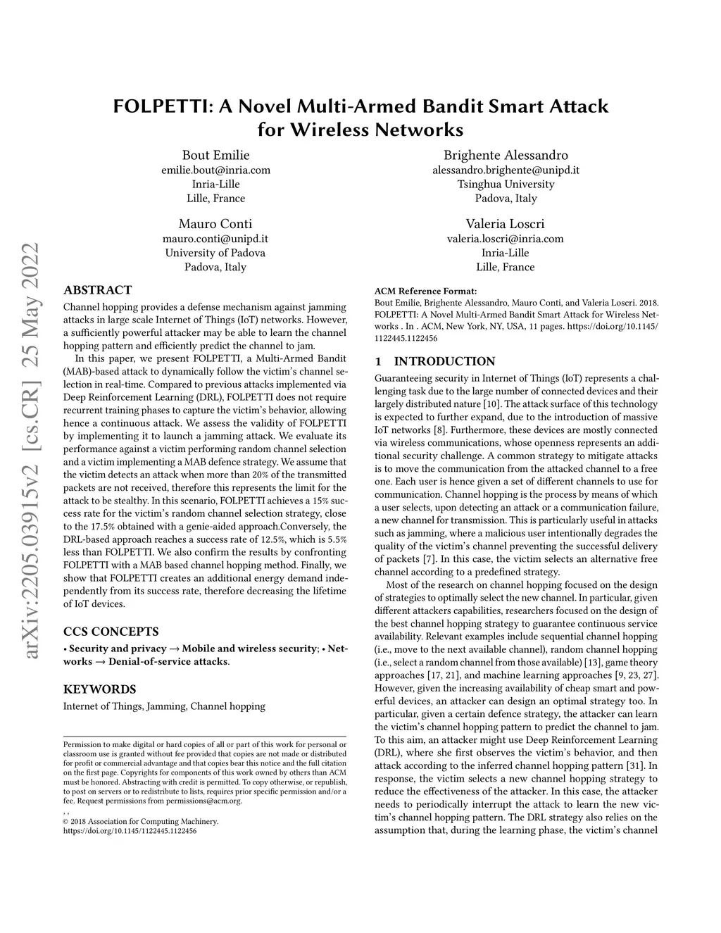FOLPETTI: A Novel Multi-Armed Bandit Smart Attack for Wireless Networks