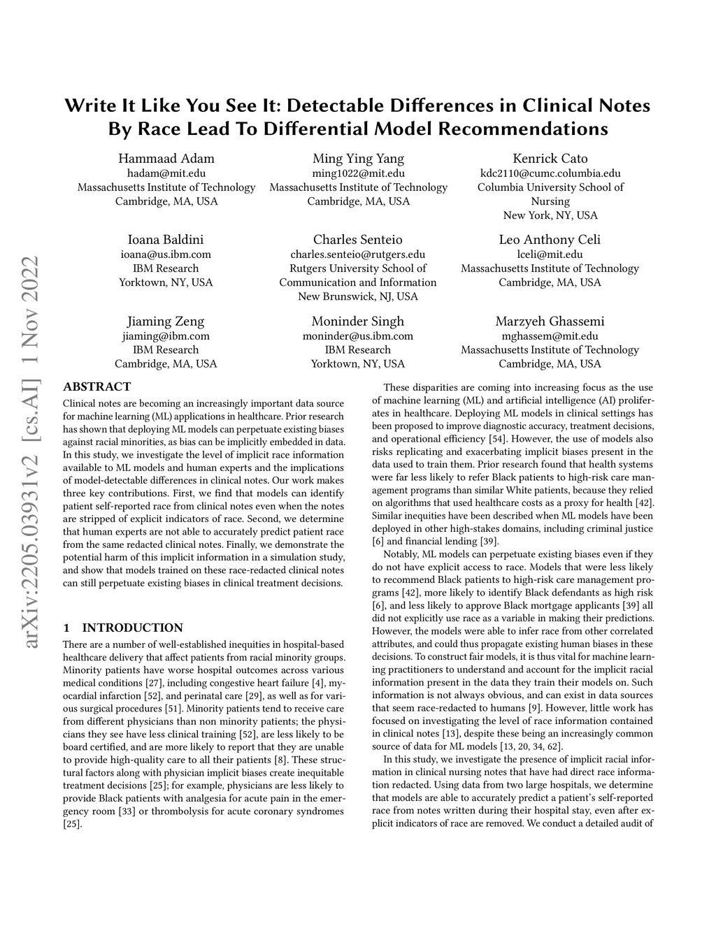 Clinical notes are becoming an increasingly important data source for machine learning (ML) applications in healthcare. Prior research has shown that deploying ML models can perpetuate existing biases against racial minorities, as bias can be implicitly embedded in data. In this study, we investigate the level of implicit race information available to ML models and human experts and the implications of model-detectable differences in clinical notes. Our work makes three key contributions. First, we find that models can identify patient self-reported race from clinical notes even when the notes are stripped of explicit indicators of race. Second, we determine that human experts are not able to accurately predict patient race from the same redacted clinical notes. Finally, we demonstrate the potential harm of this implicit information in a simulation study, and show that models trained on these race-redacted clinical notes can still perpetuate existing biases in clinical treatment decisions.