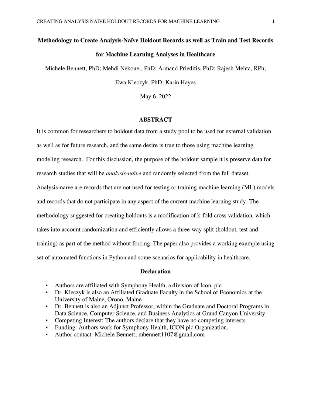 It is common for researchers to holdout data from a study pool to be used for external validation as well as for future research, and the same desire is true to those using machine learning modeling research. For this discussion, the purpose of the holdout sample it is preserve data for research studies that will be analysis-naive and randomly selected from the full dataset. Analysis-naive are records that are not used for testing or training machine learning (ML) models and records that do not participate in any aspect of the current machine learning study. The methodology suggested for creating holdouts is a modification of k-fold cross validation, which takes into account randomization and efficiently allows a three-way split (holdout, test and training) as part of the method without forcing. The paper also provides a working example using set of automated functions in Python and some scenarios for applicability in healthcare.