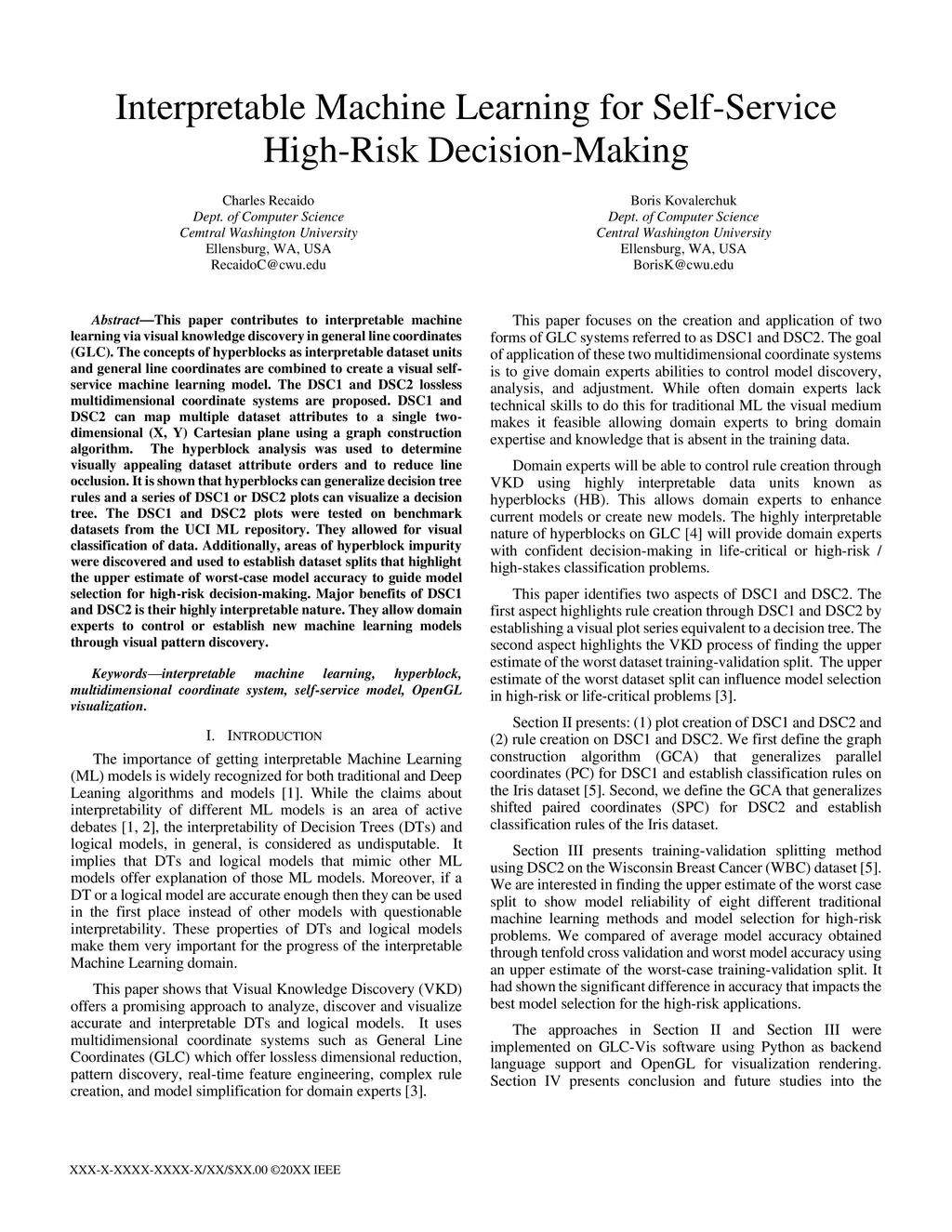 This paper contributes to interpretable machine learning via visual knowledge discovery in general line coordinates (GLC). The concepts of hyperblocks as interpretable dataset units and general line coordinates are combined to create a visual self-service machine learning model. The DSC1 and DSC2 lossless multidimensional coordinate systems are proposed. DSC1 and DSC2 can map multiple dataset attributes to a single two-dimensional (X, Y) Cartesian plane using a graph construction algorithm. The hyperblock analysis was used to determine visually appealing dataset attribute orders and to reduce line occlusion. It is shown that hyperblocks can generalize decision tree rules and a series of DSC1 or DSC2 plots can visualize a decision tree. The DSC1 and DSC2 plots were tested on benchmark datasets from the UCI ML repository. They allowed for visual classification of data. Additionally, areas of hyperblock impurity were discovered and used to establish dataset splits that highlight the upper estimate of worst-case model accuracy to guide model selection for high-risk decision-making. Major benefits of DSC1 and DSC2 is their highly interpretable nature. They allow domain experts to control or establish new machine learning models through visual pattern discovery.