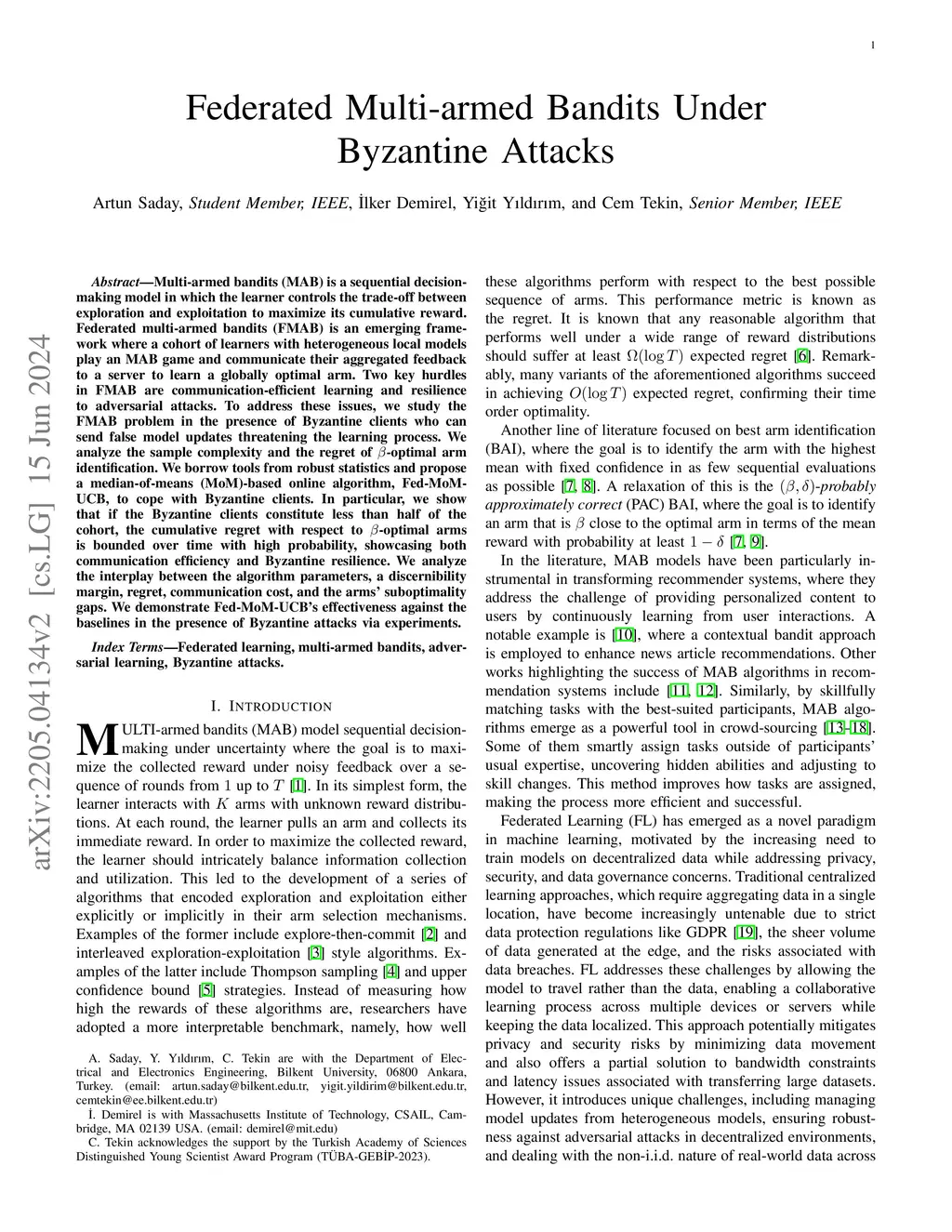 Multi-armed bandits (MAB) is a sequential decision-making model in which the learner controls the trade-off between exploration and exploitation to maximize its cumulative reward. Federated multi-armed bandits (FMAB) is an emerging framework where a cohort of learners with heterogeneous local models play an MAB game and communicate their aggregated feedback to a server to learn a globally optimal arm. Two key hurdles in FMAB are communication-efficient learning and resilience to adversarial attacks. To address these issues, we study the FMAB problem in the presence of Byzantine clients who can send false model updates threatening the learning process. We analyze the sample complexity and the regret of -optimal arm identification. We borrow tools from robust statistics and propose a median-of-means (MoM)-based online algorithm, Fed-MoM-UCB, to cope with Byzantine clients. In particular, we show that if the Byzantine clients constitute less than half of the cohort, the cumulative regret with respect to -optimal arms is bounded over time with high probability, showcasing both communication efficiency and Byzantine resilience. We analyze the interplay between the algorithm parameters, a discernibility margin, regret, communication cost, and the arms' suboptimality gaps. We demonstrate Fed-MoM-UCB's effectiveness against the baselines in the presence of Byzantine attacks via experiments.