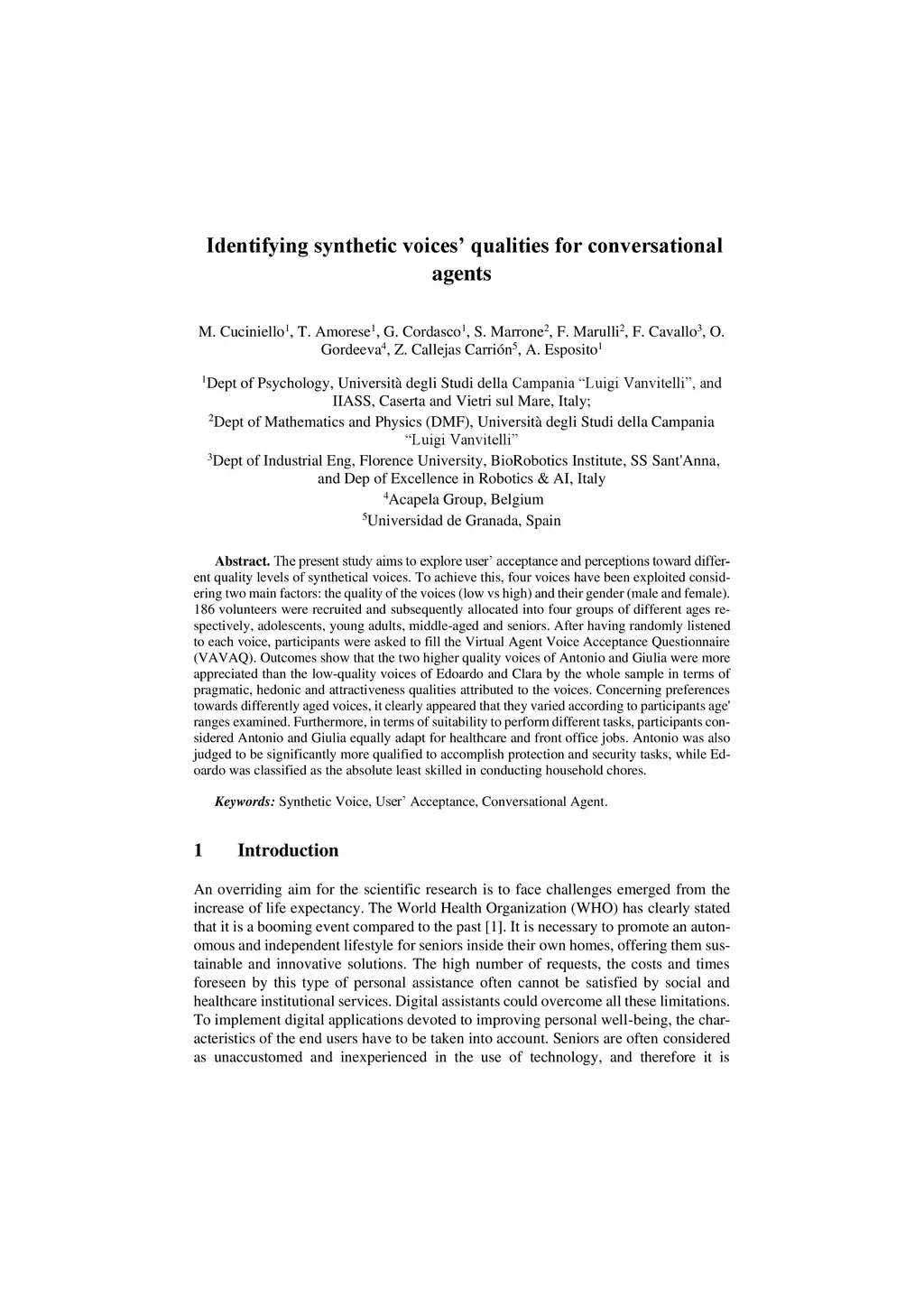 The present study aims to explore user acceptance and perceptions toward different quality levels of synthetical voices. To achieve this, four voices have been exploited considering two main factors: the quality of the voices (low vs high) and their gender (male and female). 186 volunteers were recruited and subsequently allocated into four groups of different ages respec-tively, adolescents, young adults, middle-aged and seniors. After having randomly listened to each voice, participants were asked to fill the Virtual Agent Voice Acceptance Questionnaire (VAVAQ). Outcomes show that the two higher quality voices of Antonio and Giulia were more appreciated than the low-quality voices of Edoardo and Clara by the whole sample in terms of pragmatic, hedonic and attractiveness qualities attributed to the voices. Concerning preferences towards differently aged voices, it clearly appeared that they varied according to participants age' ranges examined. Furthermore, in terms of suitability to perform different tasks, participants considered Antonio and Giulia equally adapt for healthcare and front office jobs. Antonio was also judged to be significantly more qualified to accomplish protection and security tasks, while Edoardo was classified as the absolute least skilled in conducting household chores.