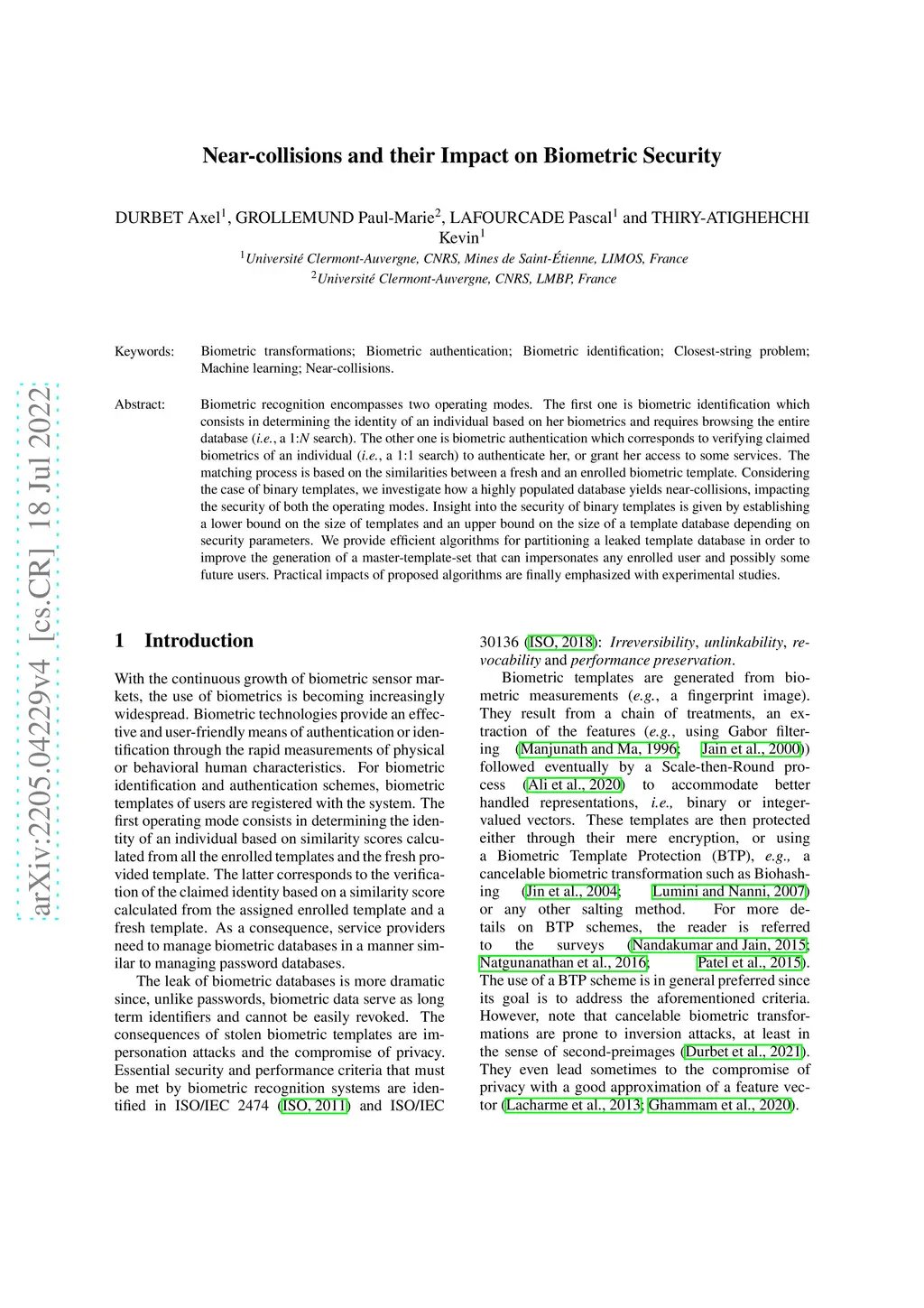 Biometric recognition encompasses two operating modes. The first one is biometric identification which consists in determining the identity of an individual based on her biometrics and requires browsing the entire database (i.e., a 1:N search). The other one is biometric authentication which corresponds to verifying claimed biometrics of an individual (i.e., a 1:1 search) to authenticate her, or grant her access to some services. The matching process is based on the similarities between a fresh and an enrolled biometric template. Considering the case of binary templates, we investigate how a highly populated database yields near-collisions, impacting the security of both the operating modes. Insight into the security of binary templates is given by establishing a lower bound on the size of templates and an upper bound on the size of a template database depending on security parameters. We provide efficient algorithms for partitioning a leaked template database in order to improve the generation of a master-template-set that can impersonates any enrolled user and possibly some future users. Practical impacts of proposed algorithms are finally emphasized with experimental studies.