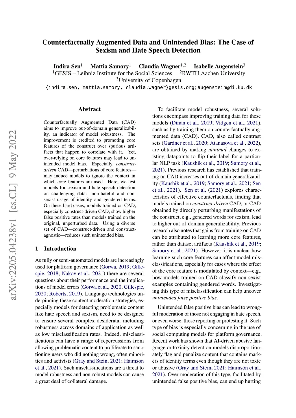 Counterfactually Augmented Data (CAD) aims to improve out-of-domain generalizability, an indicator of model robustness. The improvement is credited with promoting core features of the construct over spurious artifacts that happen to correlate with it. Yet, over-relying on core features may lead to unintended model bias. Especially, construct-driven CAD -- perturbations of core features -- may induce models to ignore the context in which core features are used. Here, we test models for sexism and hate speech detection on challenging data: non-hateful and non-sexist usage of identity and gendered terms. In these hard cases, models trained on CAD, especially construct-driven CAD, show higher false-positive rates than models trained on the original, unperturbed data. Using a diverse set of CAD -- construct-driven and construct-agnostic -- reduces such unintended bias.