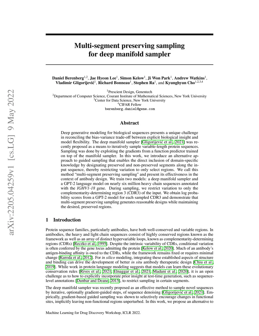 Deep generative modeling for biological sequences presents a unique challenge in reconciling the bias-variance trade-off between explicit biological insight and model flexibility. The deep manifold sampler was recently proposed as a means to iteratively sample variable-length protein sequences by exploiting the gradients from a function predictor. We introduce an alternative approach to this guided sampling procedure, multi-segment preserving sampling, that enables the direct inclusion of domain-specific knowledge by designating preserved and non-preserved segments along the input sequence, thereby restricting variation to only select regions. We present its effectiveness in the context of antibody design by training two models: a deep manifold sampler and a GPT-2 language model on nearly six million heavy chain sequences annotated with the IGHV1-18 gene. During sampling, we restrict variation to only the complementarity-determining region 3 (CDR3) of the input. We obtain log probability scores from a GPT-2 model for each sampled CDR3 and demonstrate that multi-segment preserving sampling generates reasonable designs while maintaining the desired, preserved regions.
