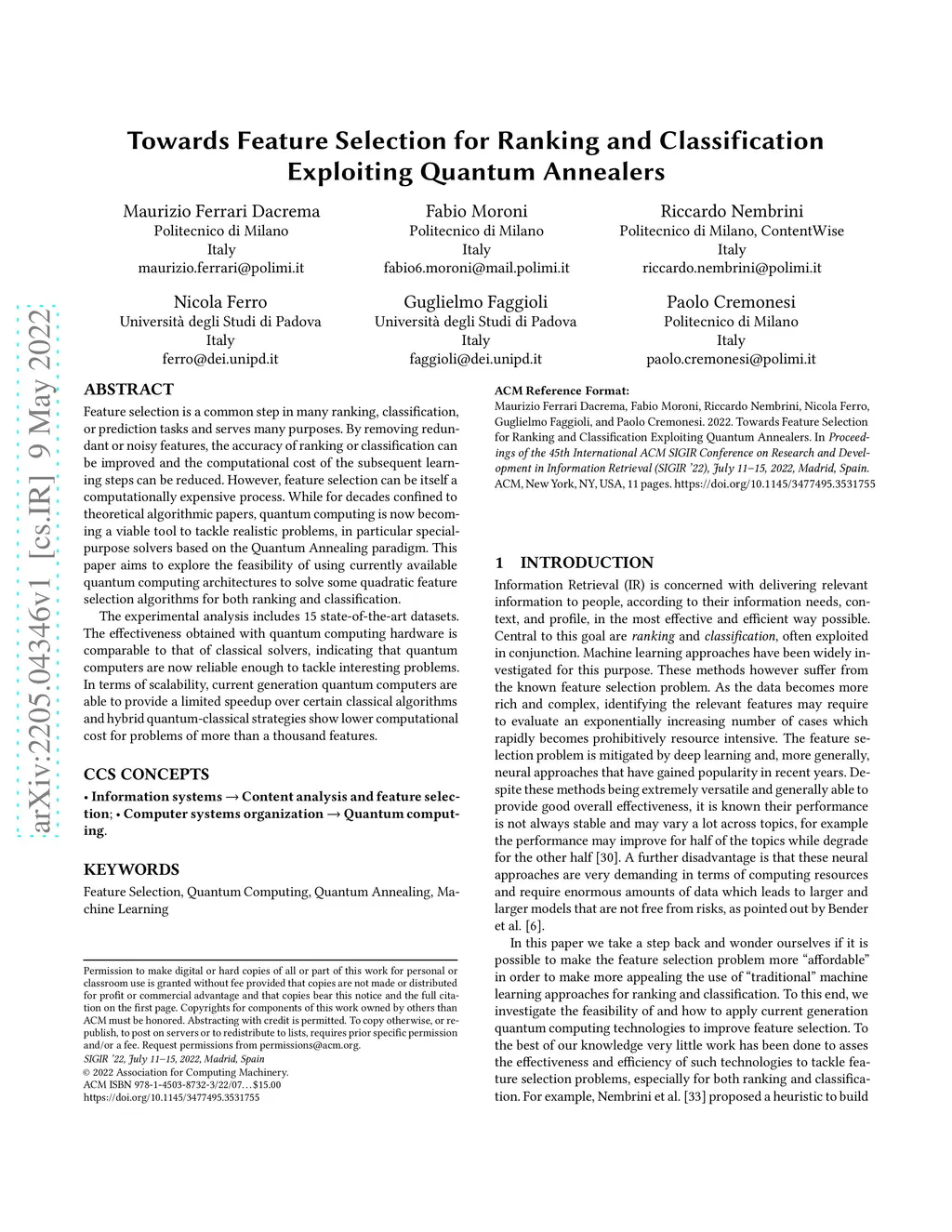 Feature selection is a common step in many ranking, classification, or prediction tasks and serves many purposes. By removing redundant or noisy features, the accuracy of ranking or classification can be improved and the computational cost of the subsequent learning steps can be reduced. However, feature selection can be itself a computationally expensive process. While for decades confined to theoretical algorithmic papers, quantum computing is now becoming a viable tool to tackle realistic problems, in particular special-purpose solvers based on the Quantum Annealing paradigm. This paper aims to explore the feasibility of using currently available quantum computing architectures to solve some quadratic feature selection algorithms for both ranking and classification. The experimental analysis includes 15 state-of-the-art datasets. The effectiveness obtained with quantum computing hardware is comparable to that of classical solvers, indicating that quantum computers are now reliable enough to tackle interesting problems. In terms of scalability, current generation quantum computers are able to provide a limited speedup over certain classical algorithms and hybrid quantum-classical strategies show lower computational cost for problems of more than a thousand features.